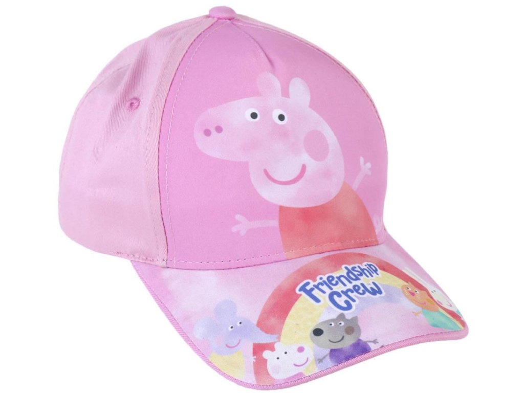 Atraktivní růžová kšiltovka inspirovaná animovaným televizním seriálem Peppa Pig a postavami z něj s nápisem Friendship Crew. Kšiltovka je přizpůsobena objemu hlavy do 51 cm, na temeni hlavy má nastavitelný řemínek, takže je schopná přizpůsobit se každé hlaviččce menšího i většího fanouška.