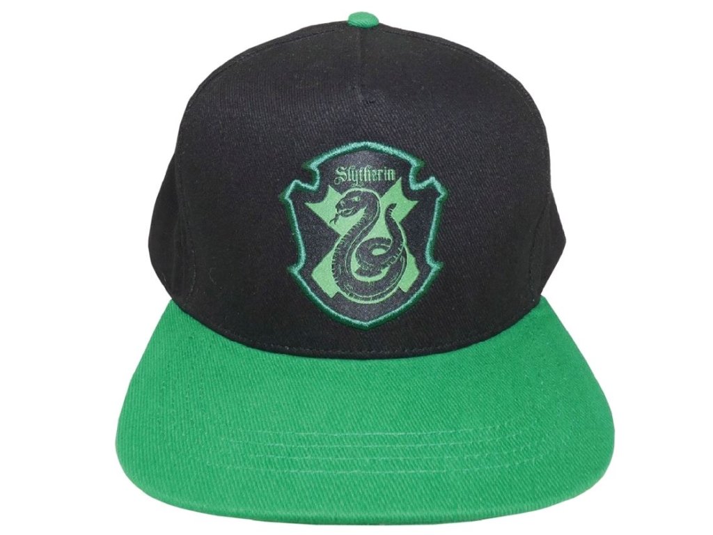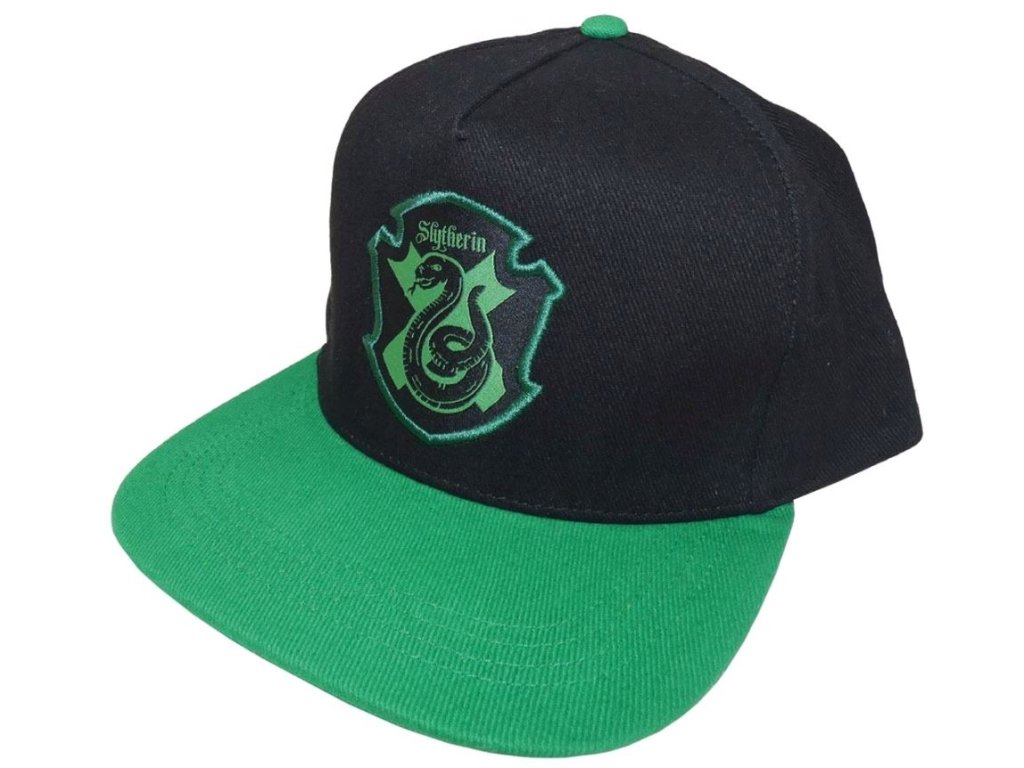Atraktivní rap černo zelená kšiltovka s rovným kšiltem. Na přední straně kšiltovky je vyšívaný znak Zmijozel z filmu Harry Potter.