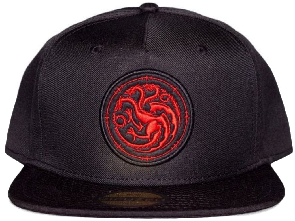 Atraktivní černá kšiltovka s rovným kšiltem má vyvedené logo rodu Targaryenů na přední části kšiltovky. Nastavitelná velikost řemínkem v zátylku.