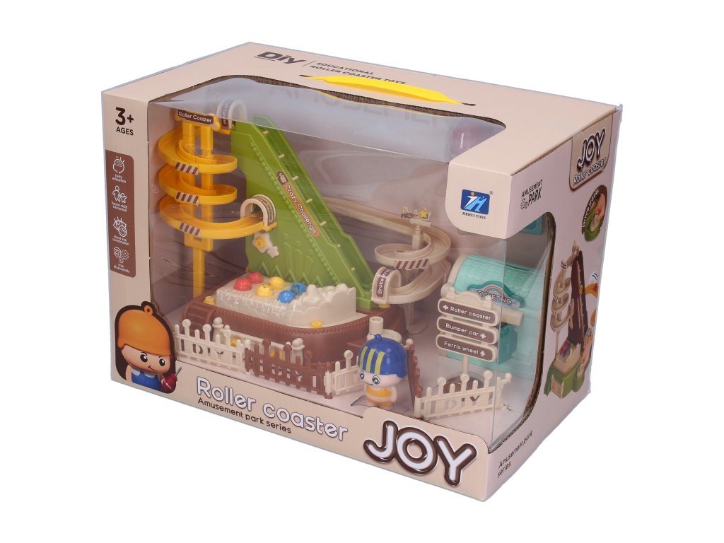 Kuličková dráha šroubovací. Velikost dráhy 18 cm. Obsah balení - šroubovací dráha, 6 kuliček, panáček, ploty, domeček na prodej lístků, šroubovák.