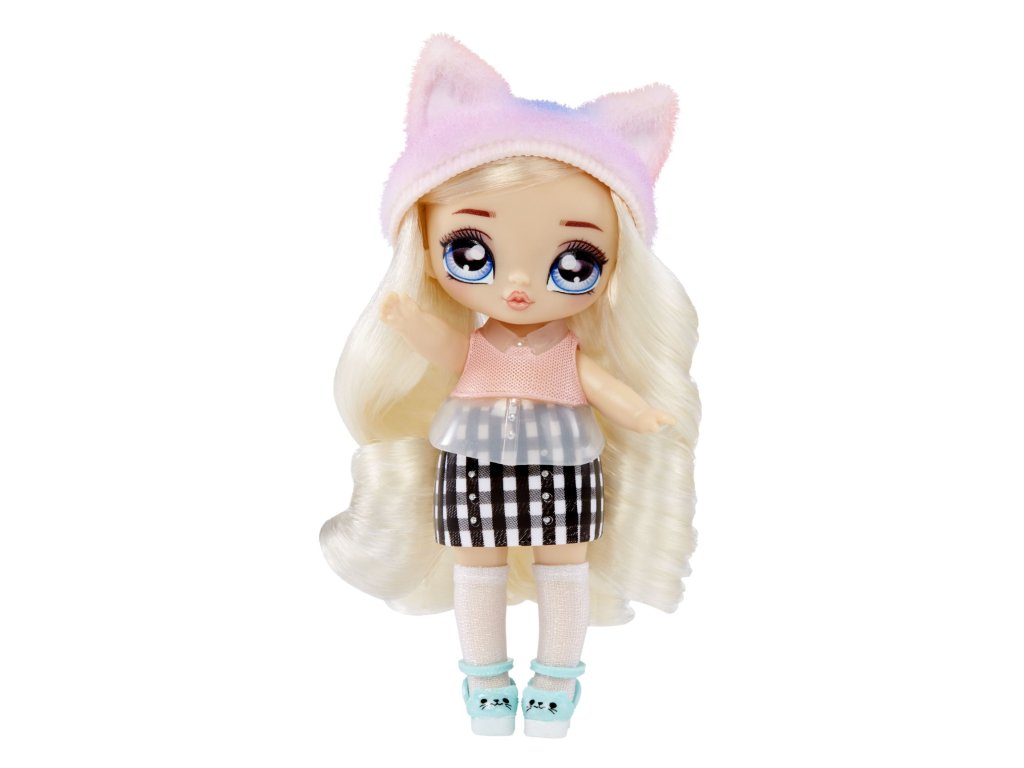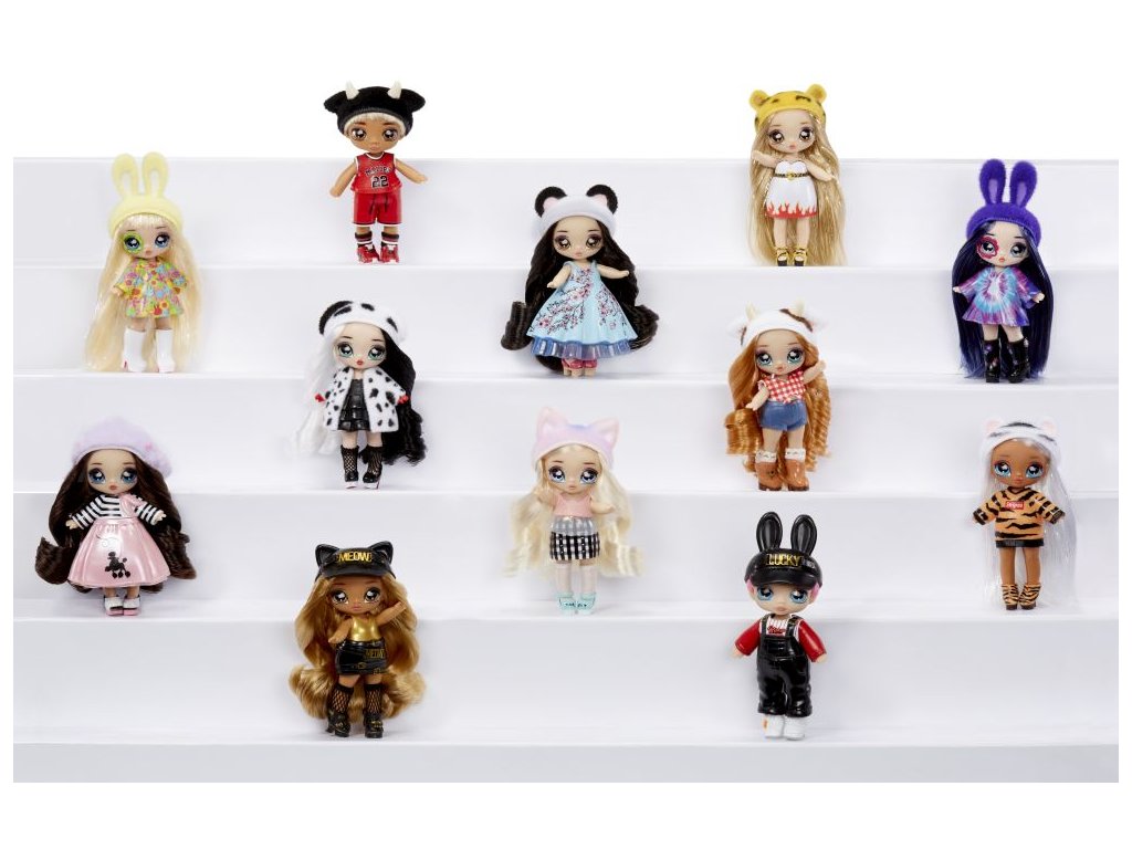 Získej oblíbenou postavičku Na! Na! Na! Surprise v úplně nové velikosti. Panenky měří 10 cm a jsou menší a roztomilejší než kdy dříve. Můžeš jich získat dalších 12 do sbírky! Každé panence se otáčí hlava, má tvarovatelnou čepici, která je měkoučká a chlupatá, a panenky mají pohyblivé klouby v ramenou a kyčlích.