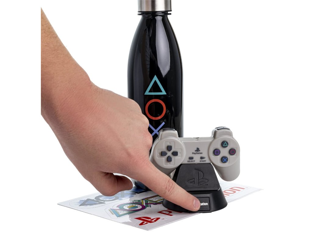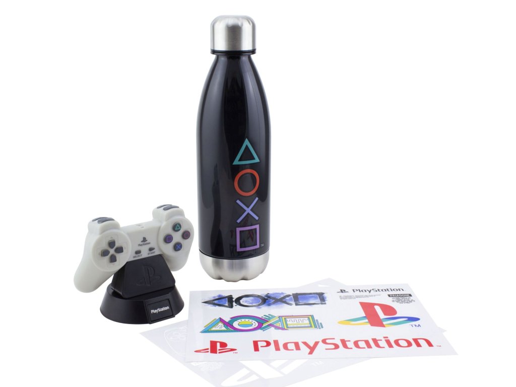 Tato dárková sada PlayStation je ideální pro každého konzolové hráče. Třídílná sada obsahuje láhev na vodu, lampu a sadu nálepek. Opakovaně použitelná plastová láhev na vodu o objemu 460 ml je ideální pro použití a má ideální velikost pro váš batoh nebo držák v autě. Osvětlete jakýkoli prostor pomocí ikony ovladače PlayStation Controller Icon Light (vyžaduje 2 baterie AAA, které nejsou součástí balení). Přizpůsobte si a zkrášlete své věci pomocí dvou archů samolepek.