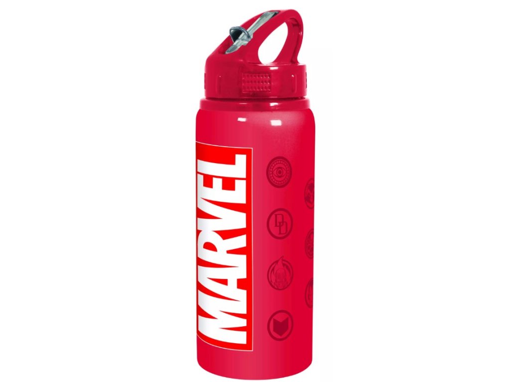 Červená hliníková láhev na pití s víčkem se slámkou s logem společnosti Marvel. Láhev je vhodná pro všechny menší i větší fanoušky a cestovatele.