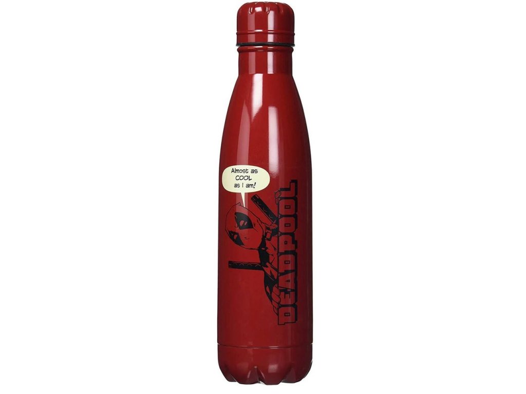 Nezerová červená láhev na pití s grafikou superhrdiny Deadpoola.