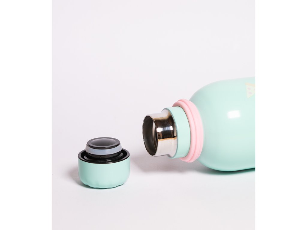 Světle modrá láhev na pití se šroubovacím víčkem inspirovaná kočkou Pusheen.