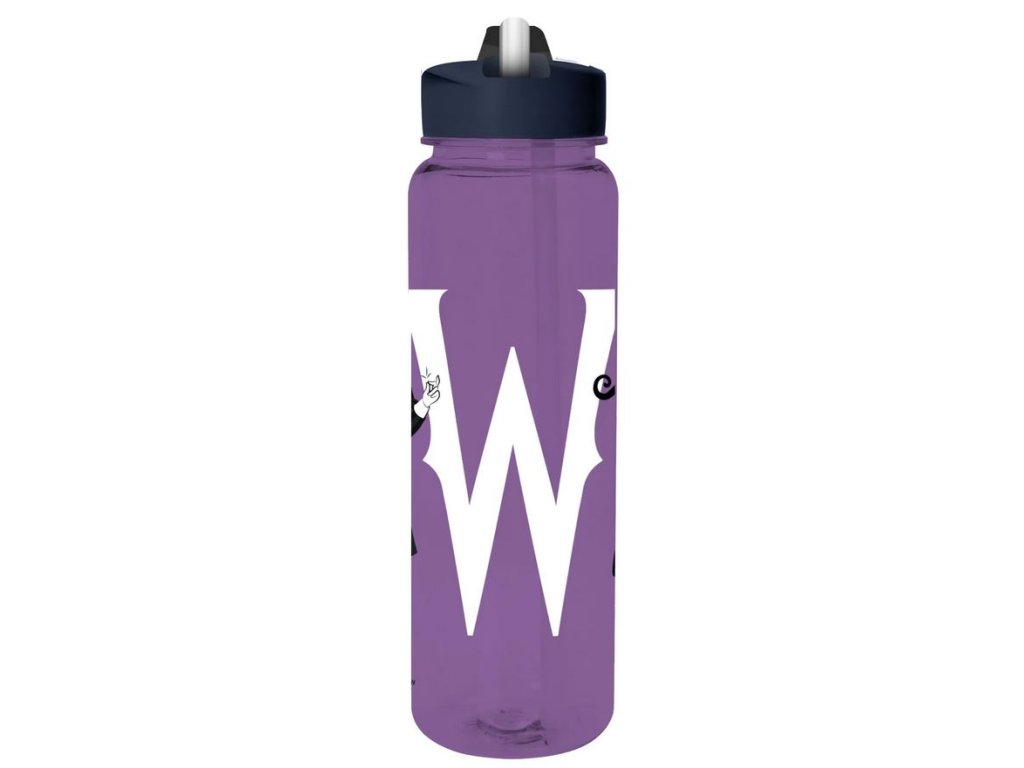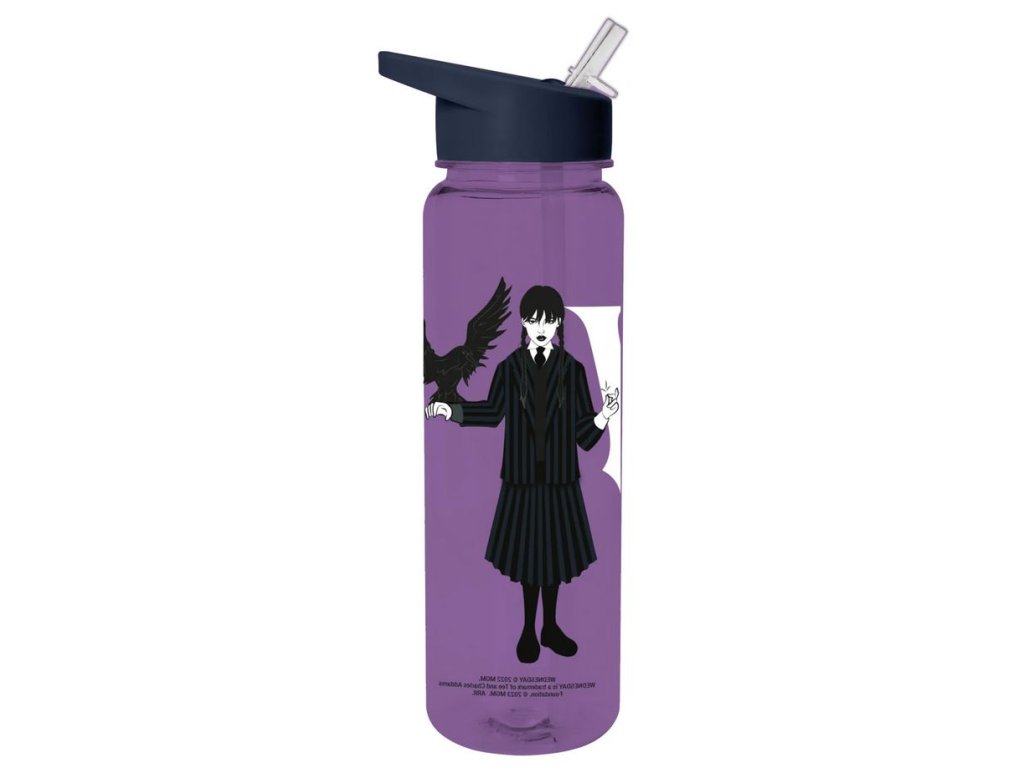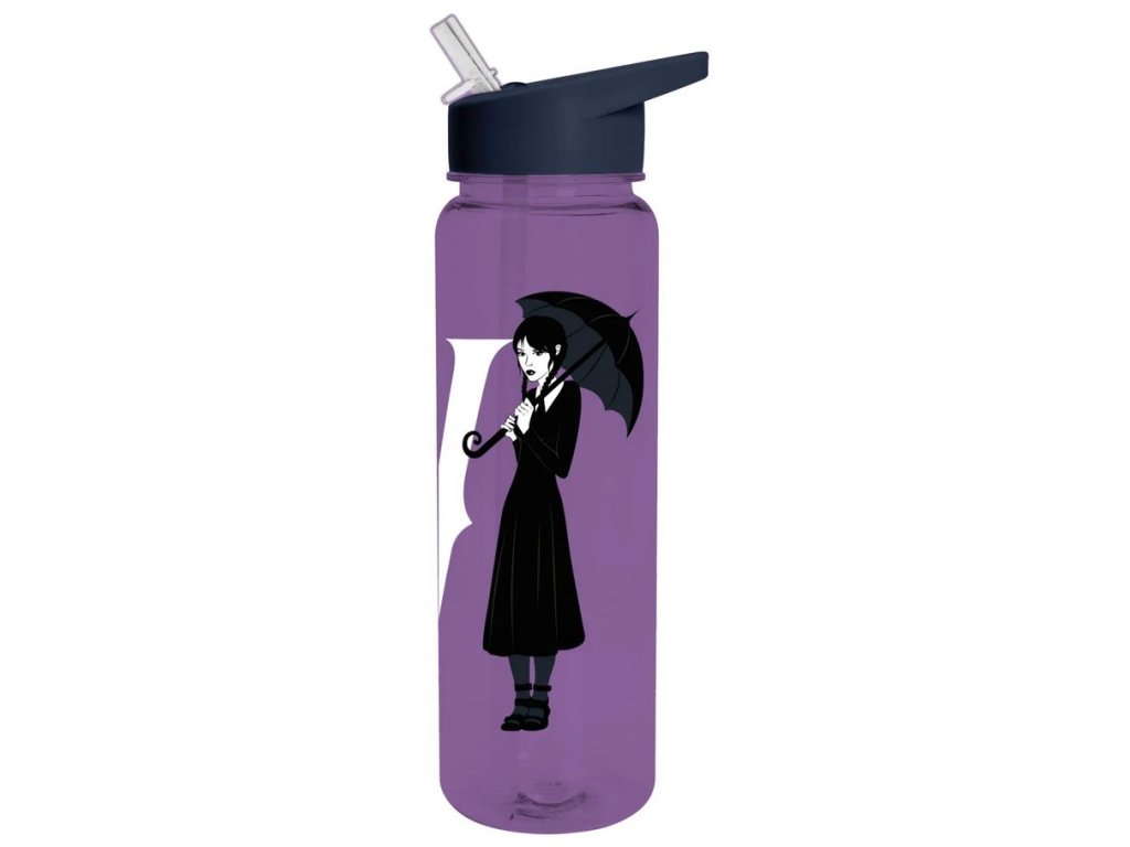 Plastová fialová láhev na pití s víčkem s pítkem, vyvedená s bílou grafikou písmene W, na druhé straně se nachází silueta Wednesday Adammsové s deštníkem. Láhev je vhodná pro všechny menší i větší fanoušky tohoto dramatické seriálu Wednesday.