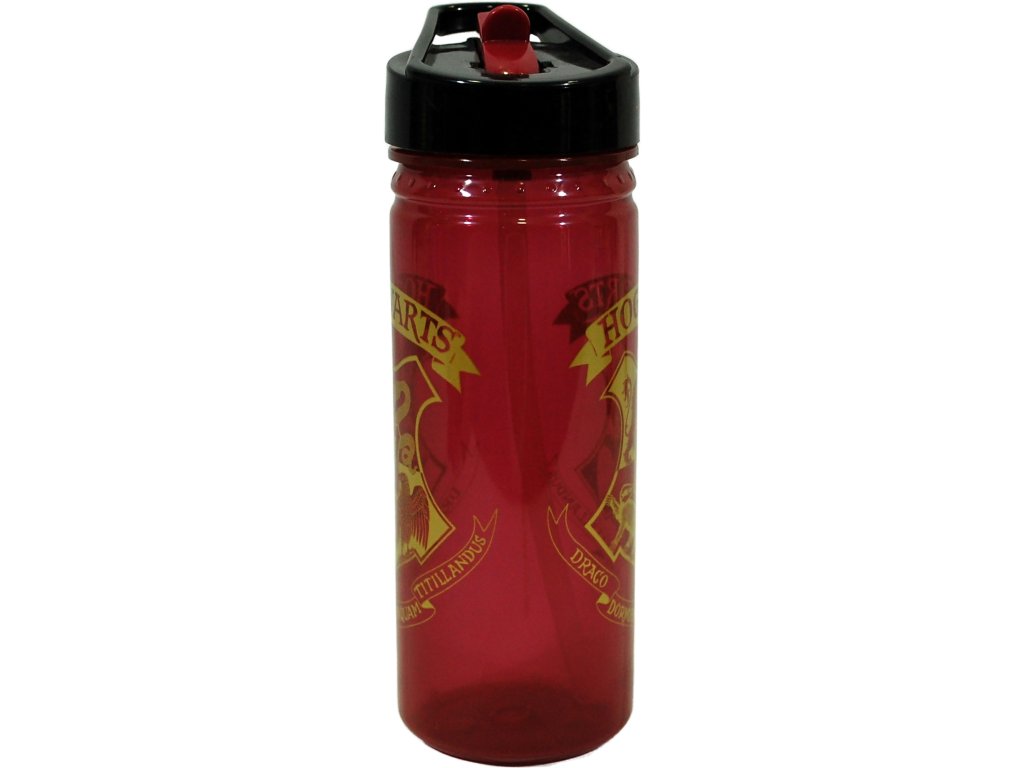 Červená láhev na pití s víčkem s pítkem s grafikou erbu školy čar a kouzel v Bradavicích ze ságy Harryho Pottera. Láhev je vhodná pro všechny menší i větší fanoušky.