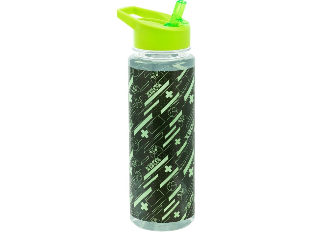 Průhledná plastová láhev na pití se šroubovacím víčkem s brčkem a logem XBOX.