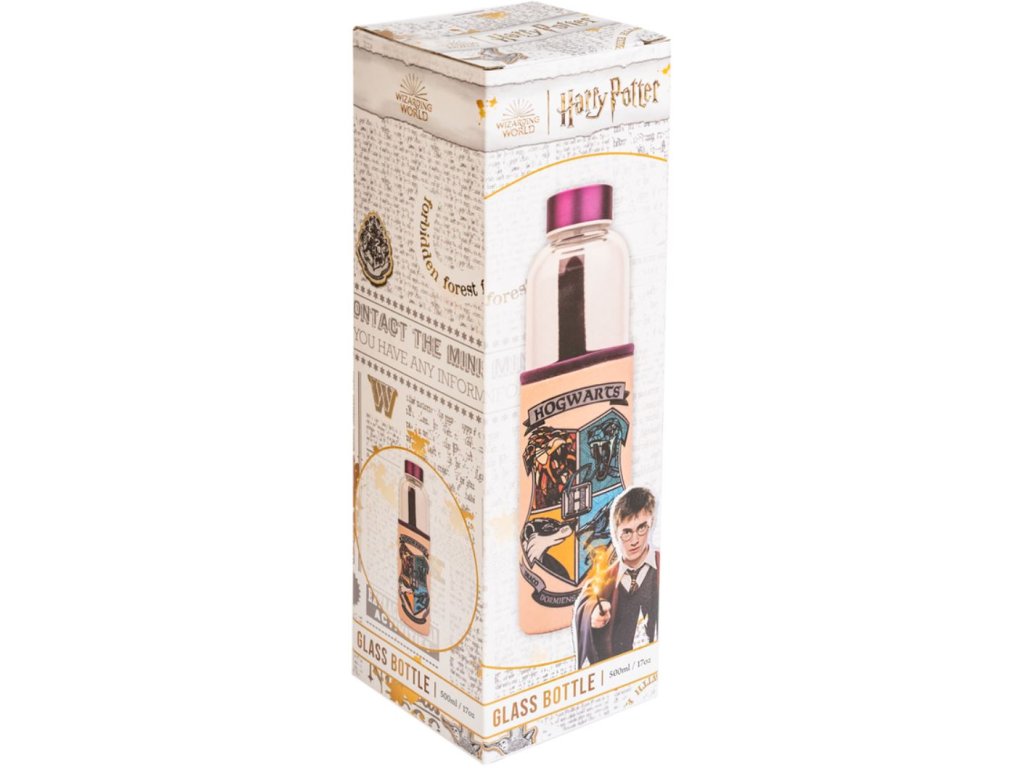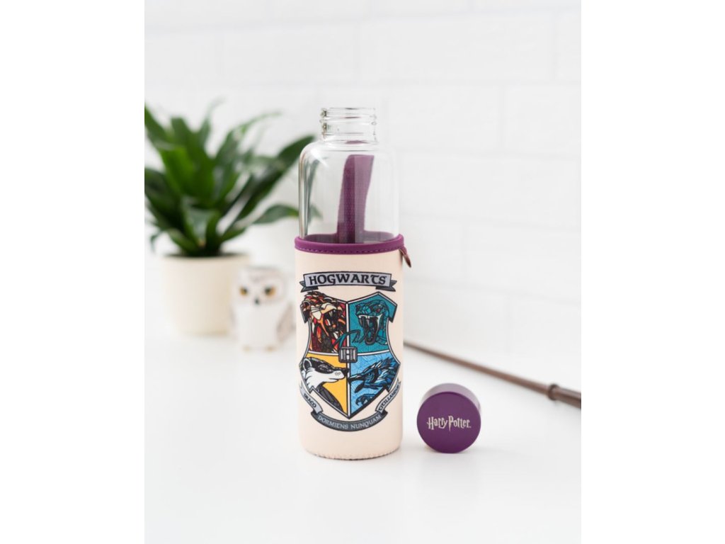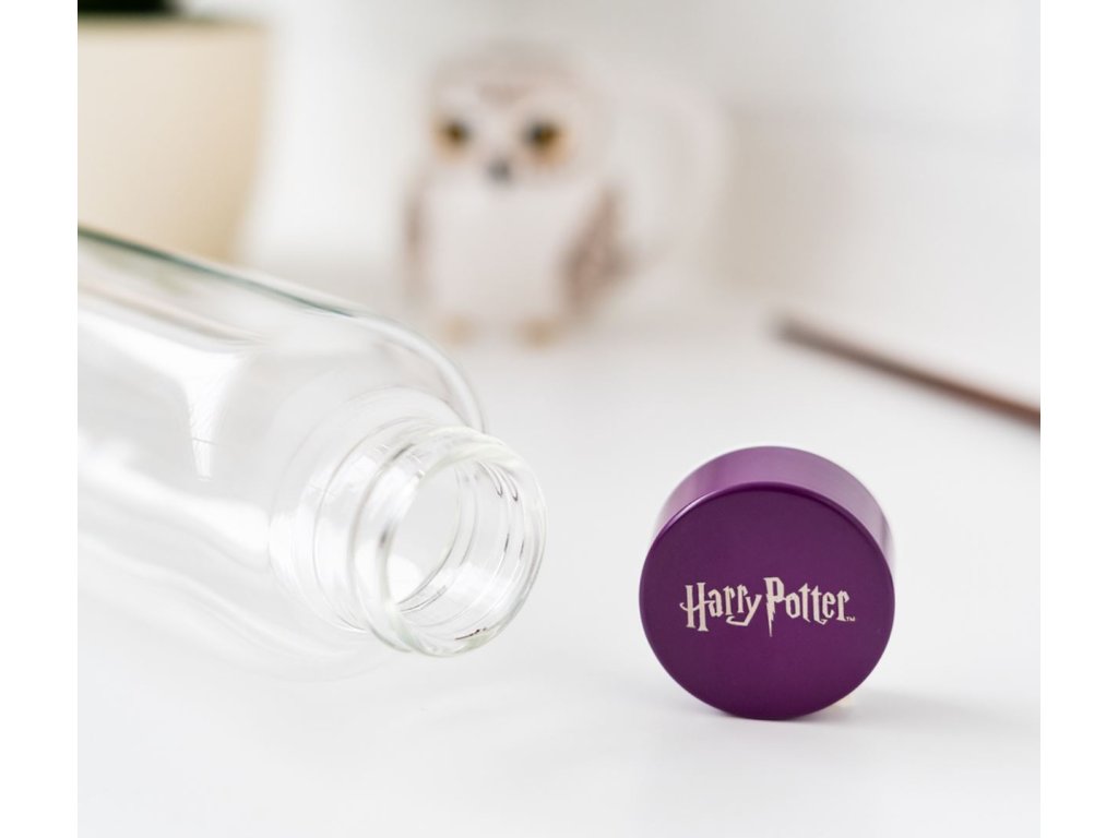 Oficiální produkt - skleněná láhev na pití z katalogu outdoorových produktů s fotografiemi, grafikou a licencí slavné knižní a filmové kouzelnické sci-fi ságy Harry Potter.