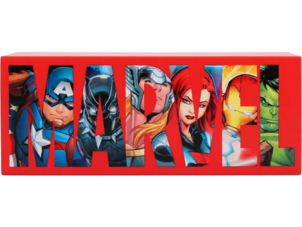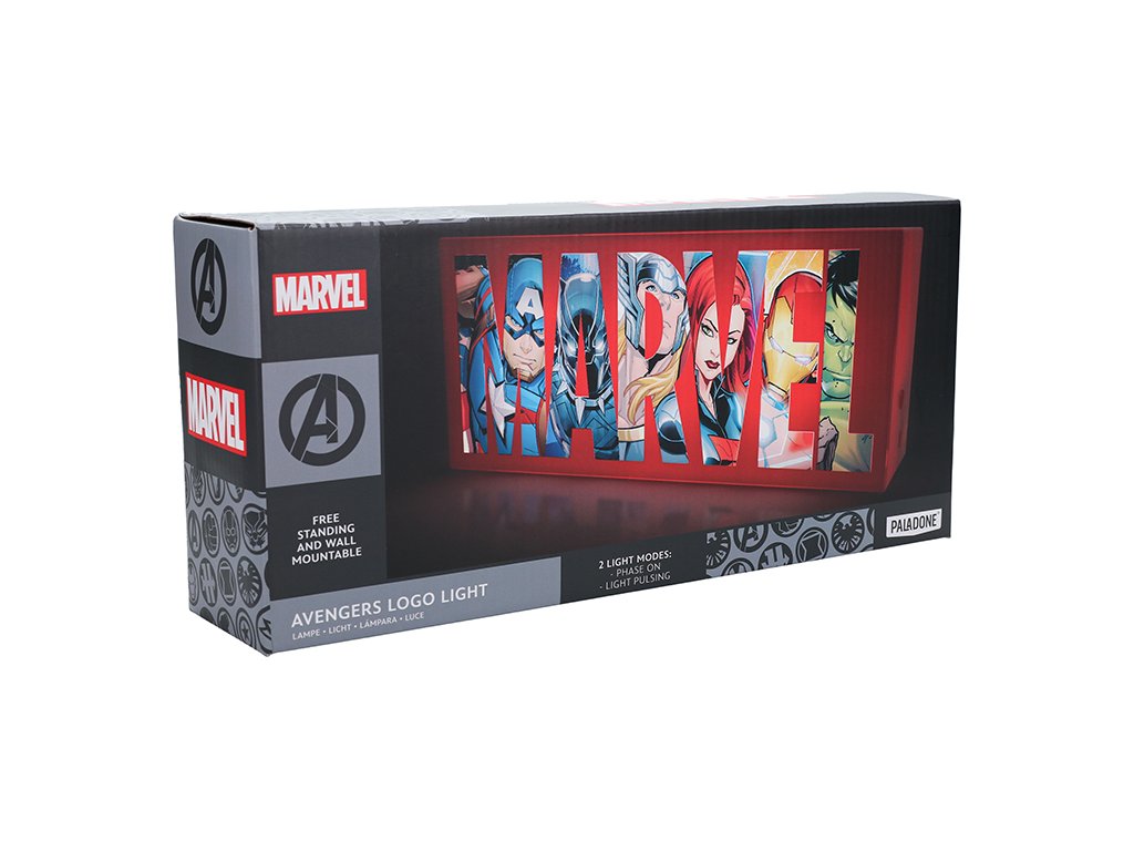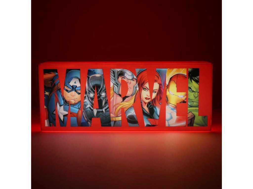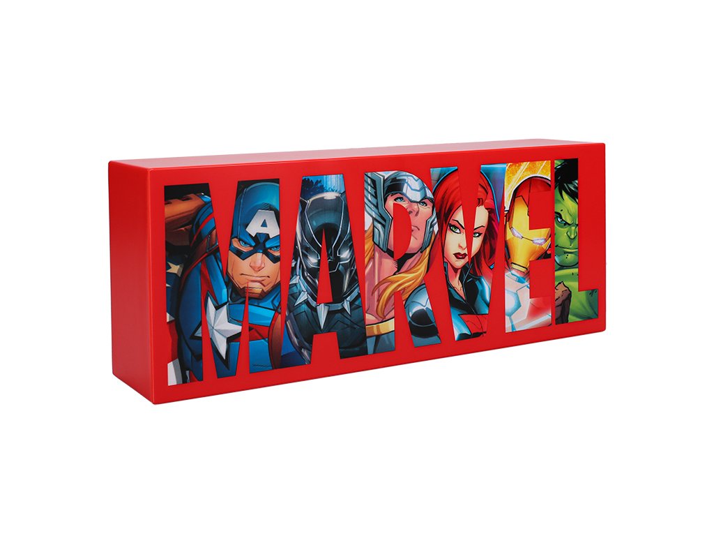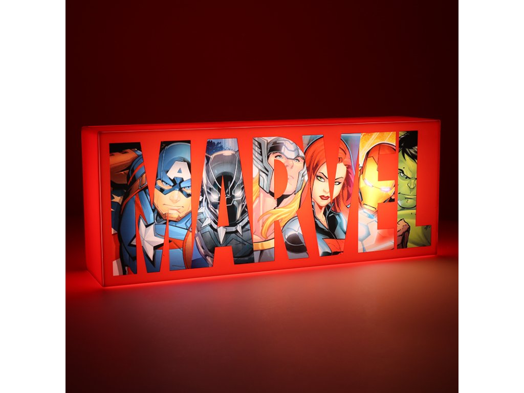 Dekorativní červená stolní lampa s možností pověšení na zeď s grafikou loga, ve kterém jdou vidět superhrdinové od společnosti Marvel. Lampička nabízí 2 světelné módy (svítí a bliká). Napájení s přiloženým USB kabelem nebo třemi AAA bateriemi, které nejsou součástí balení.