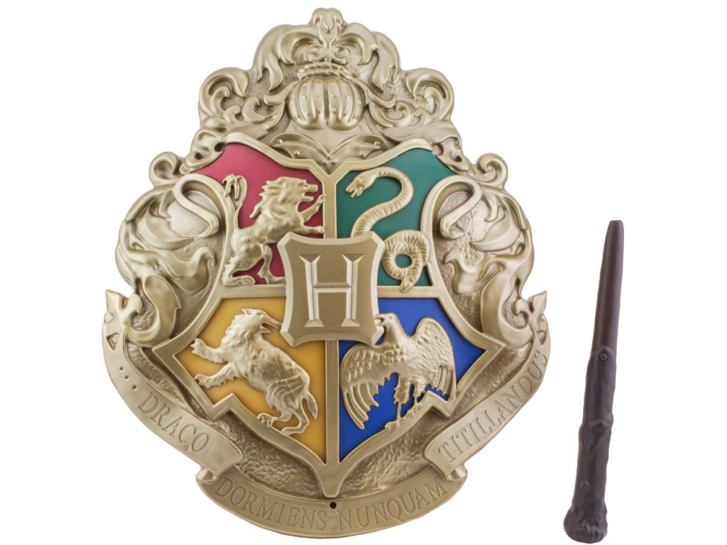 3D lampa dekorativní stolní s ovladačem v podobhě hůlky s motivem Howarts crest and magic wand z kouzelnické ságy Harryho Pottera může být umístěná na odnímatelném stojanu anebo ji lze zavěsit a stěnu.