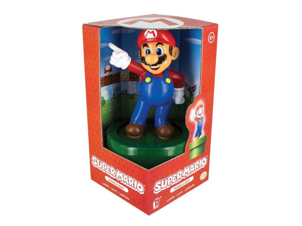 Oficiální lampa a doplňkové zboží z katalogu produktů s logem, fotografiemi a grafikou počitačové hry Super Mario.