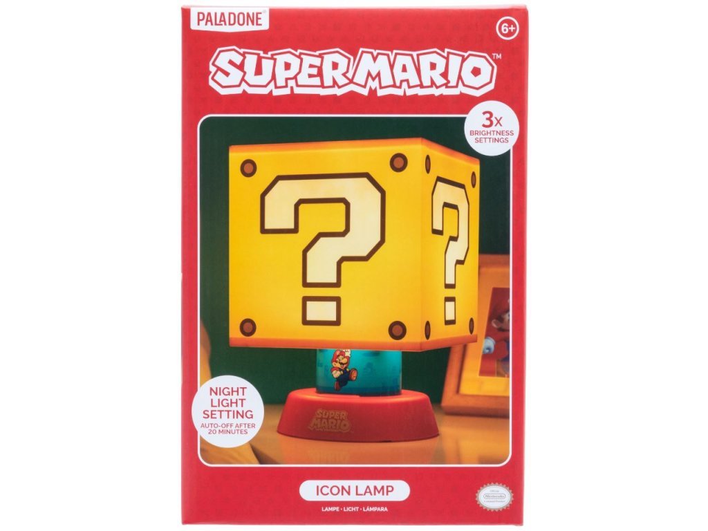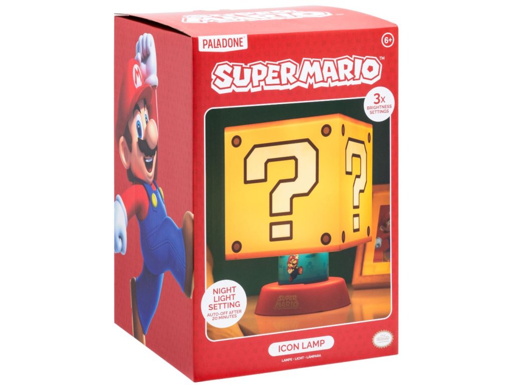 Stolní dekorativní 3D lampa vyrobena v bloku kostky ze hry Super Mario. Poháněno pomocí tři AA baterií nebo přes USB kabel, baterie ani kabel nejsou součástí balení.