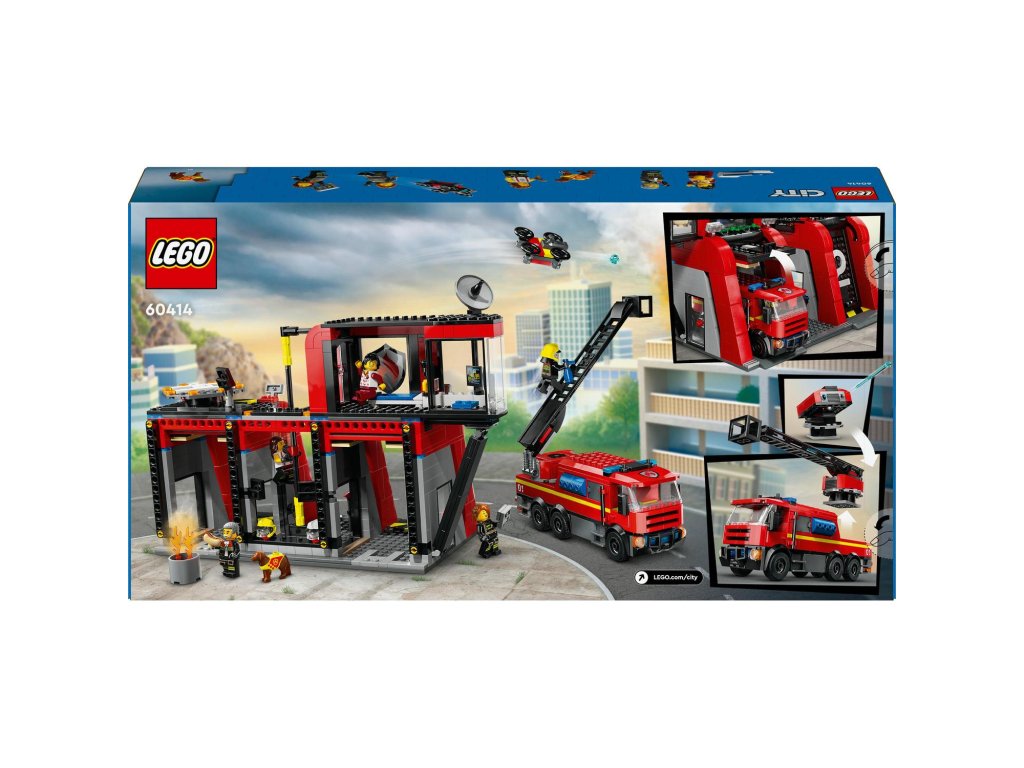 Povzbuďte dětskou představivost herní stavebnicí 60414 LEGO® City Hasičská stanice s hasičským vzorem pro děti od 6 let. Součástí stanice je moderní řídicí centrum, kuchyňka a místy pro spaní nad prostory s vybavením, dále 2 garáže s vysokými sklápěcími dveřmi. Stavebnice obsahuje také dron a hasičskou stříkačku s modulárním žebříkem a přídavnými hasicími přístroji. Mobilizujte posádku čítající 5 minifigurek a hasičského psa a vydejte se vstříc hodinám akcí nabité hry na hasiče. Děti mohou tutostavebnici používat v kombinaci s ostatními z řady Lego City (prodávané samostatně) pro ještě úžasnější dobrodružství!