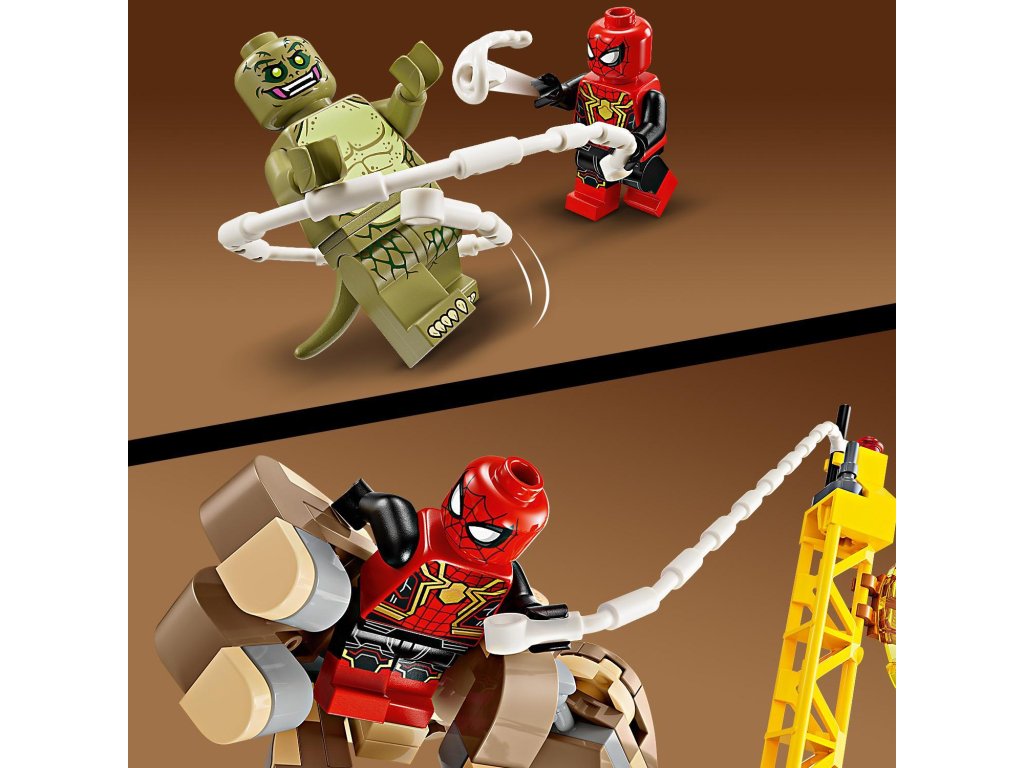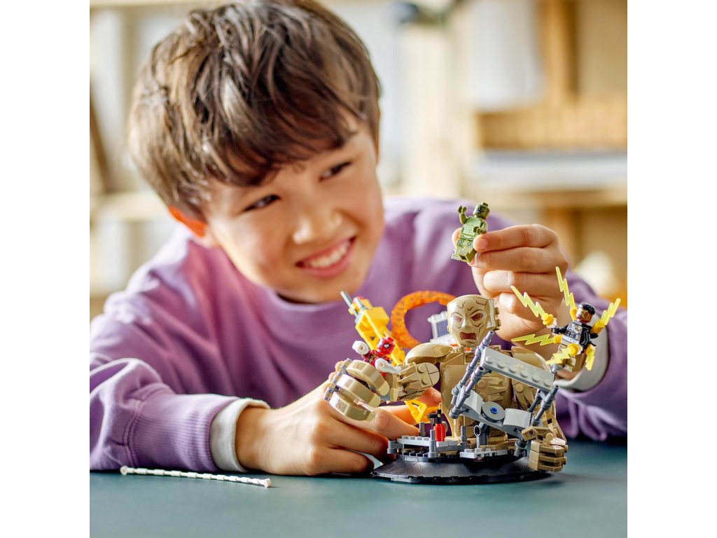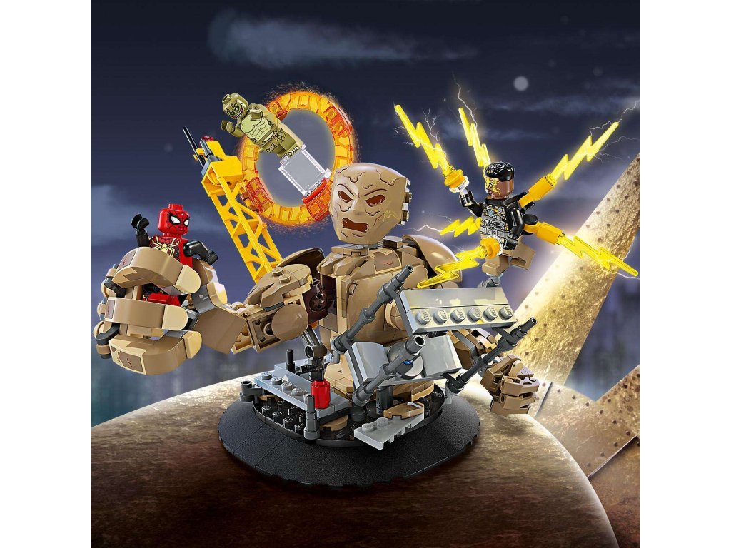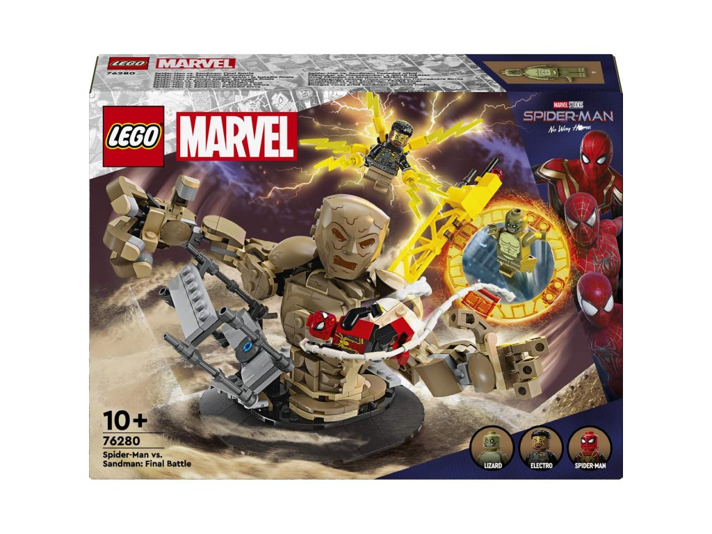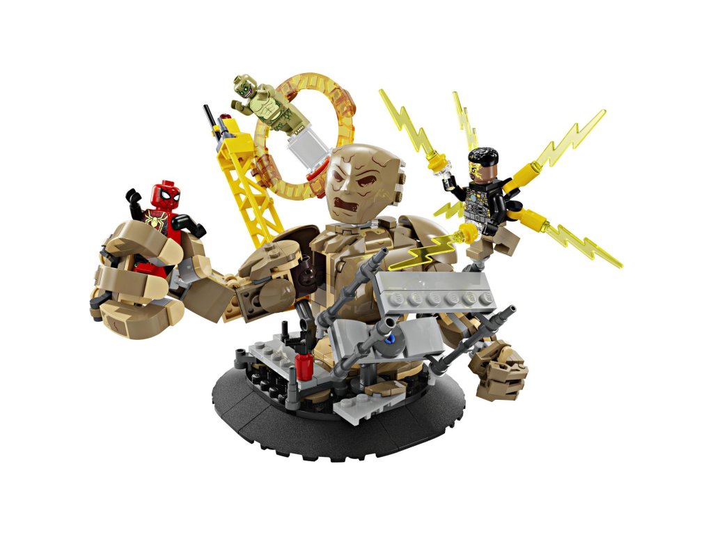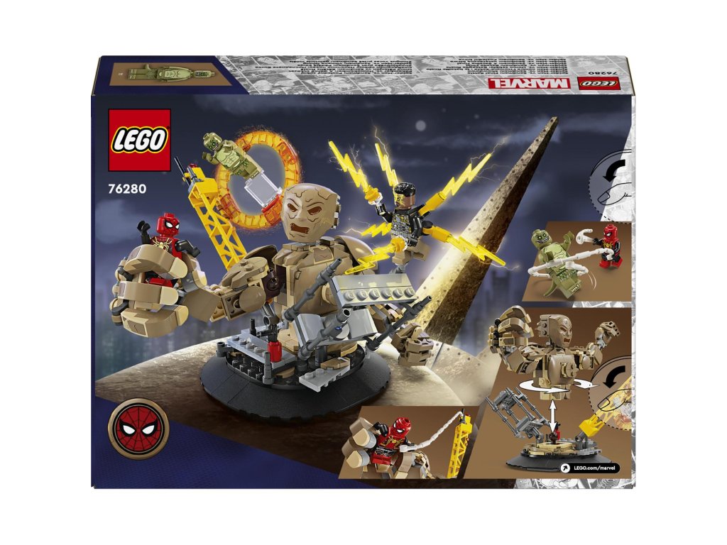 Součástí této kreativní stavebnice z řady LEGO Marvel se Spider-Manem jsou 3 padouchové: Sandman, Electro a Lizard (jedná se o zcela první stavebnici LEGO Marvel s minifigurkou Lizarda). Minifigurky lze umístit hned na několik míst v různých polohách a stavebnice tak nabízí nepřeberné možnosti hraní a vystavování. Sandman je plně pohyblivý a děti ho mohou otáčet a chytat do jeho obřích rukou Spider-Mana, který se nad ním vznáší na svém pavučinovém „laně“. Stavebnici lze kombinovat se sadou Spider-Manova konečná bitva (76261) (prodává se samostatně) pro další herních možnosti. Pro ještě více digitální zábavy je zde zábavná a intuitivní aplikace LEGO Builder, kde mohou stavitelé přibližovat a otáčet modely ve 3D a sledovat postup.