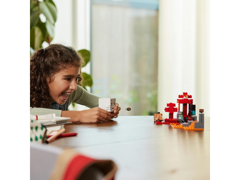 Součástí stavebnice je figurka skřetího válečníka s vlastním skinem, který se vydá portálem do Netheru na hranici mezi karmínovým lesem a čedičovými deltami. Hráči se mohou pustit do průzkumu stromů plných hub a bojovat s řadou oblíbených mobů, na které během putování narazí: 2 pekelné slizy, hoglinem, jehož útoky hlavou se ovládají prstem, a figurkou ďasa, která z tlamy střílí disky. Ďas má ve zvyku ničit portály – pozor, aby vás navždy neuvěznil! Malí stavitelé si oblíbí aplikaci LEGO Builder, ve které mohou přibližovat a otáčet stavebnice ve 3D a sledovat svůj pokrok.