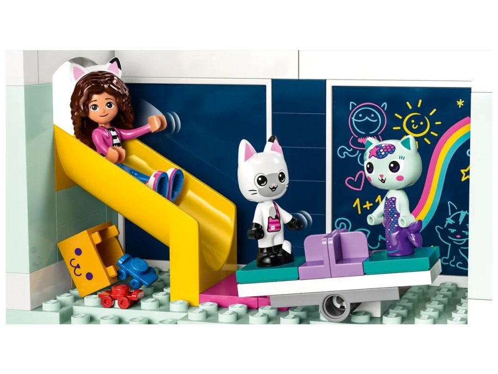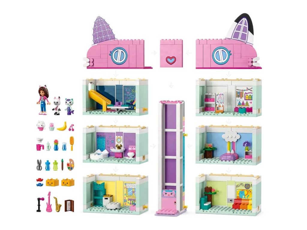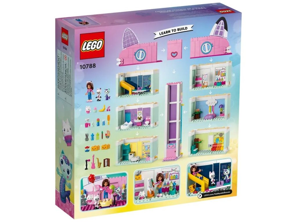 Gábinin kouzelný domek má 8 barevných pokojů propojených posuvným výtahem. V každém pokoji čeká na děti spousta aktivit. Mohou například péct v kuchyni, projet se na skluzavce v herně, tvořit v uměleckém pokoji, hrát na klavír v hudebním pokoji, relaxovat v koupelně, zdřímnout si v ložnici nebo se vydat na střechu a rozjet párty s otáčecím tanečním parketem. Parťáky jim budou 4 oblíbené postavy ze seriálu: Gábi, Pandy Ťapka, Dortě a Rybočka. Součástí je návod na stavění v podobě příběhu a aplikace LEGO Builder obsahuje intuitivní nástroje přiblížení a otáčení modelu. Začátečnická kostka zajistí, aby se děti mohly rovnou pustit do stavění.