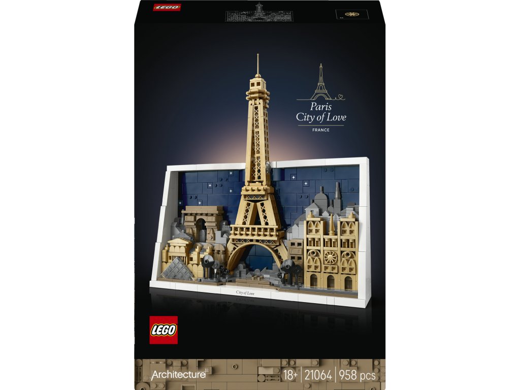Ukažte světu svou lásku k Paříži a jejím ikonickým památkám se sběratelskou stavebnicí LEGO® Architecture Paříž – město lásky (21064) pro dospělé od 18 let. Tento výstavní kousek poslouží jako úžasný architektonický dárek pro vás a všechny milovníky historie či cestování. Prozkoumejte hvězdnou oblohu a panorama města během stavění. Prohlédněte si detaily Eiffelovy věže, pařížské katedrály Notre-Dame, Vítězného oblouku a Louvru. Model dolaďte ozdobnou kostkou s nápisem „City of Love“ a rámečkem z kostek, a pak ho pověste na zeď nebo vystavte na poličce doma nebo v kanceláři.