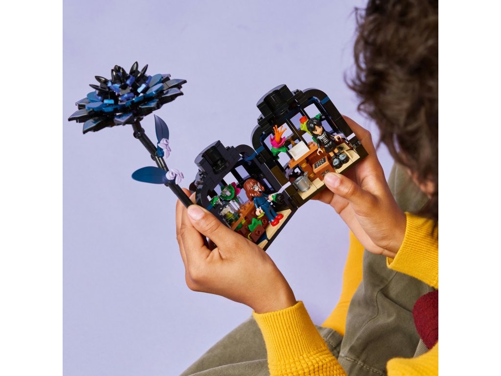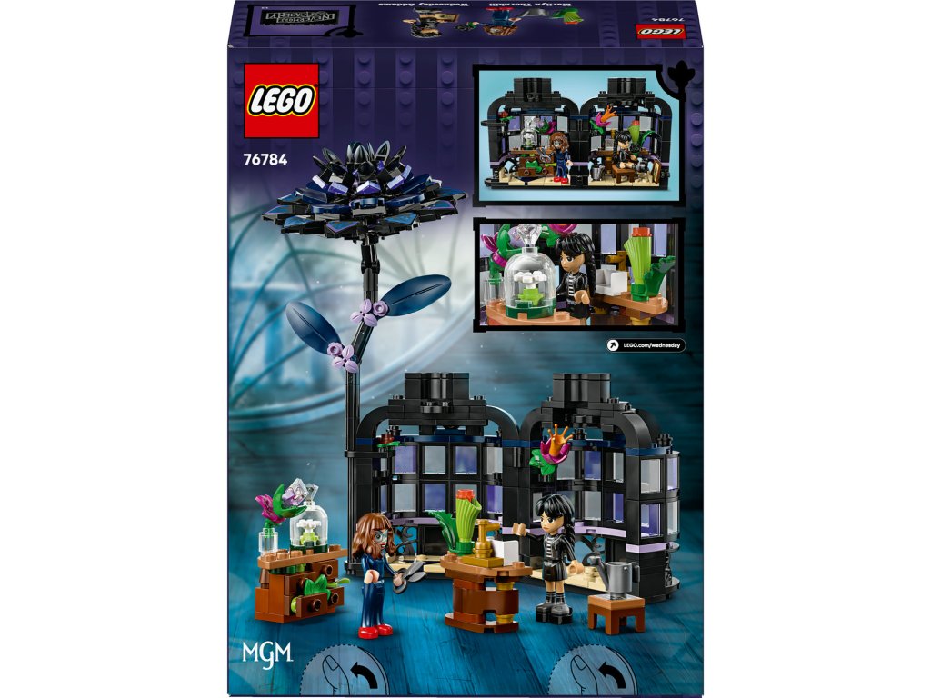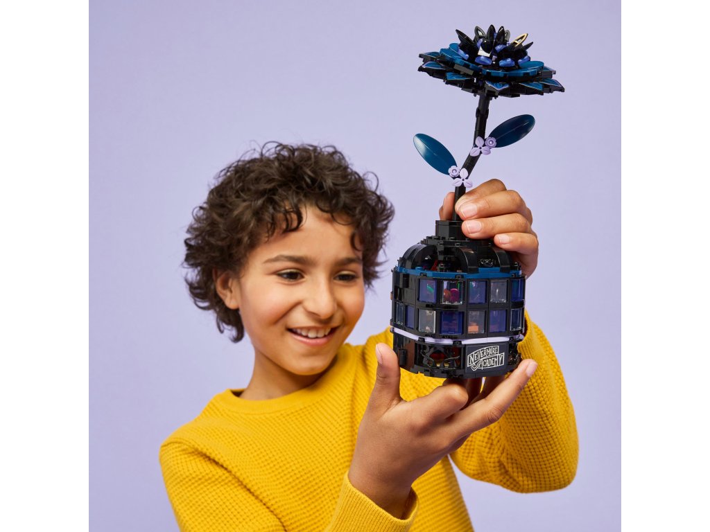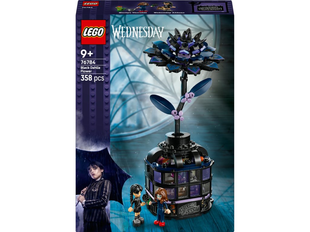 Stavebnice LEGO® Wednesday (76784) Černá jiřina představuje elegantní výstavní kousek pro milovníky botaniky a designu od 9 let. Tato bytová dekorace obsahuje černou jiřinu s listy a světle fialovými pupeny a vázu, která připomíná miniaturní zimní zahradu. Po sestavení můžou děti odejmout květ jiřiny, odemknout vázu a odhalit učebnu uvnitř, ve které najdou odnímatelné lavice, stoličku a další doplňky pro vyprávění příběhů. Součástí stavebnice jsou také minipanenky Wednesday Addamsové a profesorky Marilyn Thornhillové na hraní na postavy.