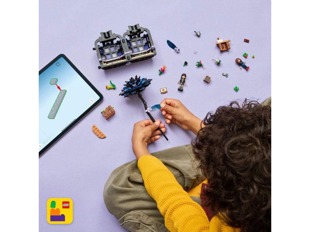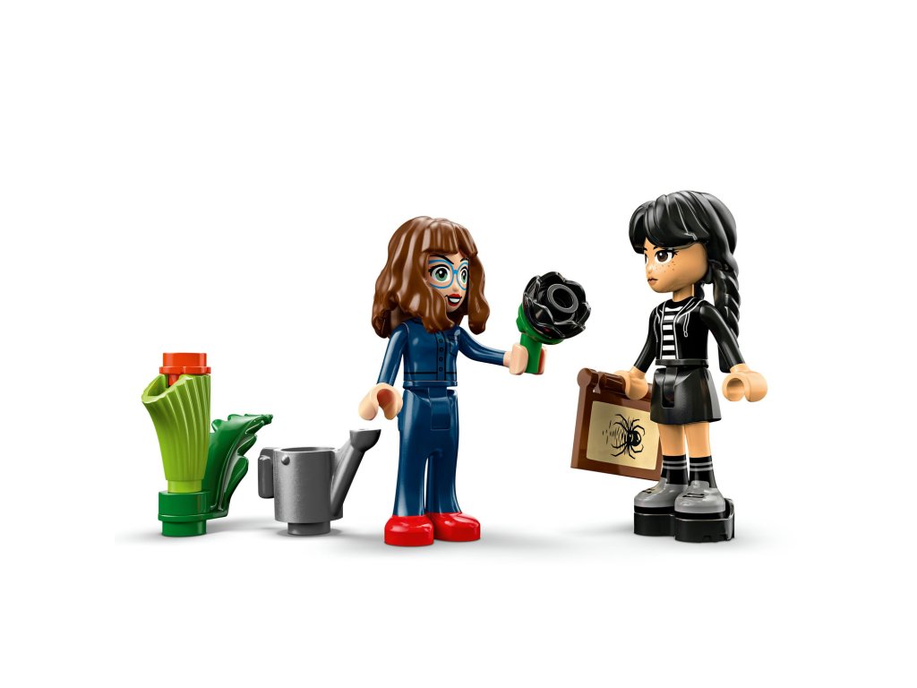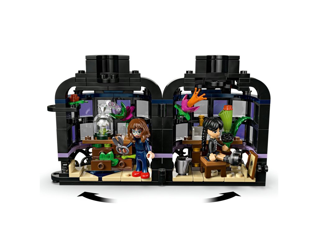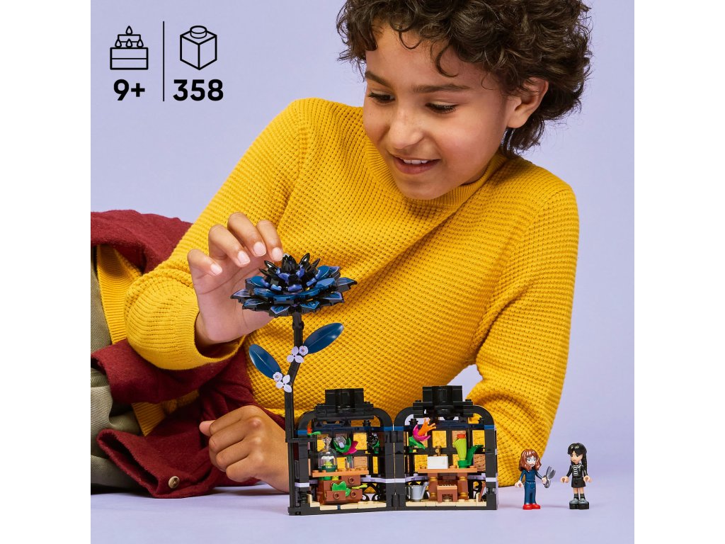 Stavebnice LEGO® Wednesday (76784) Černá jiřina představuje elegantní výstavní kousek pro milovníky botaniky a designu od 9 let. Tato bytová dekorace obsahuje černou jiřinu s listy a světle fialovými pupeny a vázu, která připomíná miniaturní zimní zahradu. Po sestavení můžou děti odejmout květ jiřiny, odemknout vázu a odhalit učebnu uvnitř, ve které najdou odnímatelné lavice, stoličku a další doplňky pro vyprávění příběhů. Součástí stavebnice jsou také minipanenky Wednesday Addamsové a profesorky Marilyn Thornhillové na hraní na postavy.