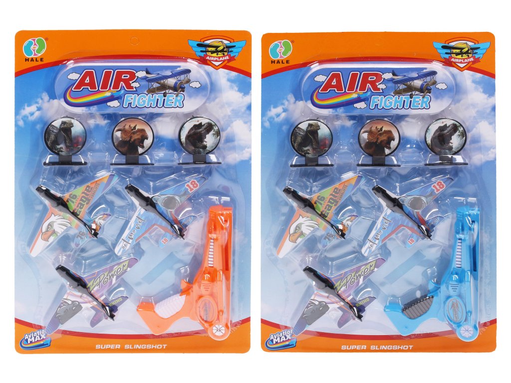 Letadla vystřelovací 3 ks. Rozměry letadla 14,5x9,5 cm, pistole 17x5,5x15 cm. 2 varianty pistole - modrá, oranžová.