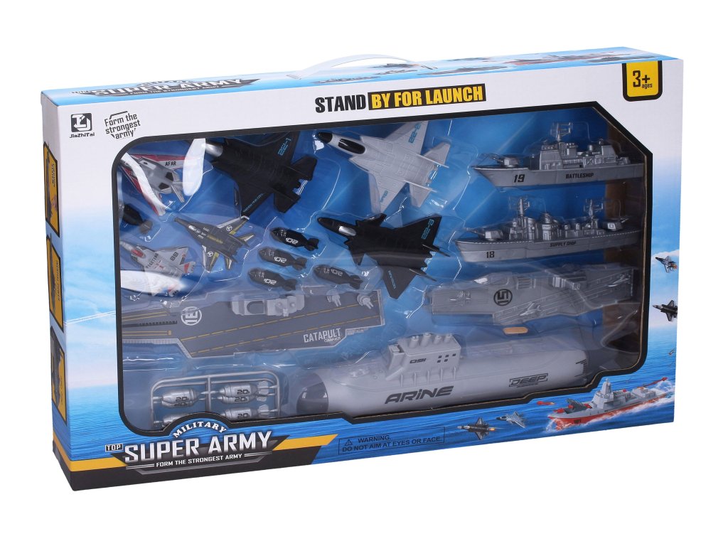 Letadlová loď s katapultem 25 cm set s ponorkou. Obsah balení - letadlová loď na setrvačník s katapultem na stíhačky 25 cm, ponorka s vystřelováním torpéd 28 cm na setrvačník, letadlová loď 18 cm, bitevní loď 16 cm, bitevní křižník 14 cm, 3x stíhačka volná kola 12 cm, 3x stíhačka katapultovací 7 cm, 12x torpédo do ponorky. Katapult - vložte stíhačku do pružiny v přední části letadlové lodě, vystřelení tlačítkem na věži. Torpédo - odklopte dvířka v horní části ponorky - vložte torpédo (max 3), sejměte přední krytku ponorky, natažením a puštěním ocasního kormidla ponorky vystřelíte torpédo. Obrázkový návod na obalu.