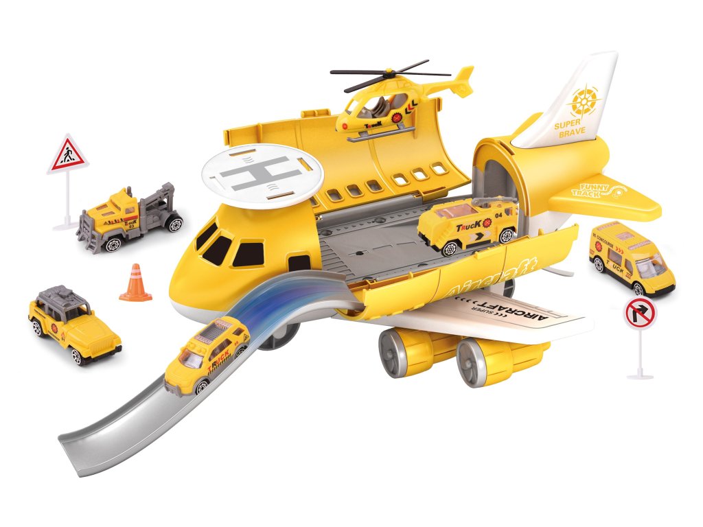 Letadlová stanice stavební. Rozměry 30x29x14 cm. Součástí 4 auta, 1 vrtulník. Volná kola. Obsahuje letadlovou stanici, 4 malé dopravní prostředky, dráhu, heliport, značky, kužely. Obrázek na sestavení na boční straně obalu.