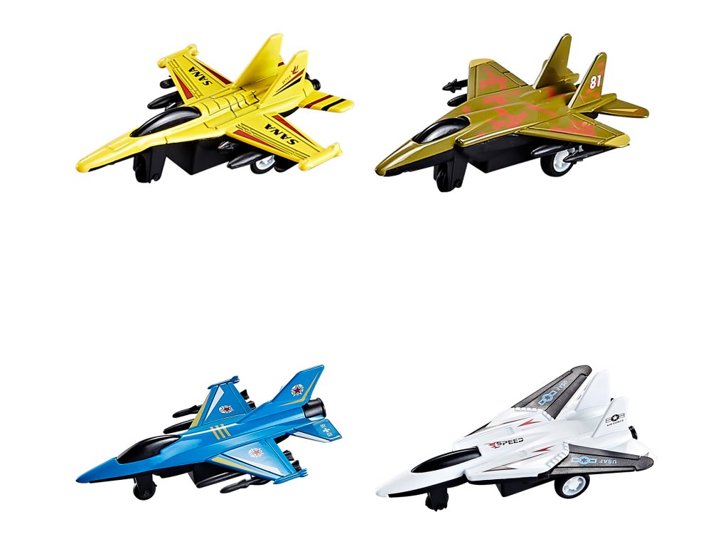 Stíhačka kovová. Rozměry 10x7x4 cm. Na zpětné natažení. 12 ks display box. 4 varianty - bílá, modrá, zelená, žlutá.
