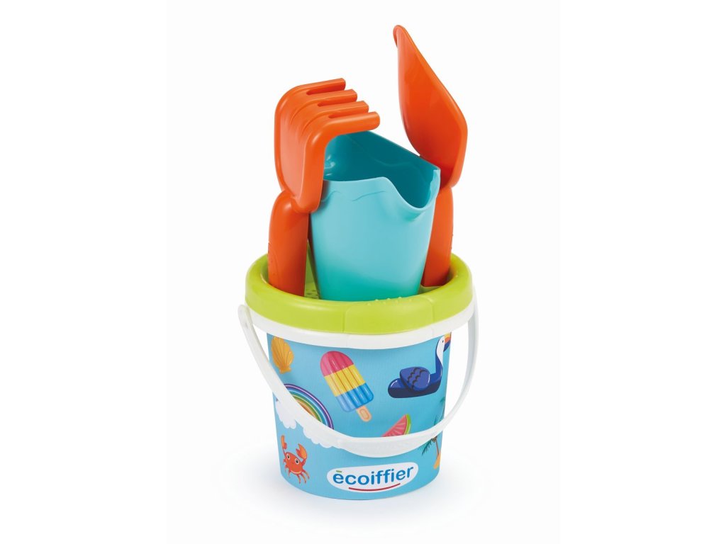 Kyblíček s prázdninovým motivem s konvičkou, sítkem, hrabičkami a lopatičkou. Průměr kyblíčku 12 cm, výška kyblíčku 15 cm.