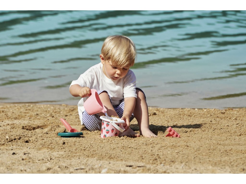 Kyblíček s jahůdkovým motivem s konvičkou, sítkem, hrabičkami a lopatičkou. Průměr kyblíčku 12 cm, výška kyblíčku 15 cm.