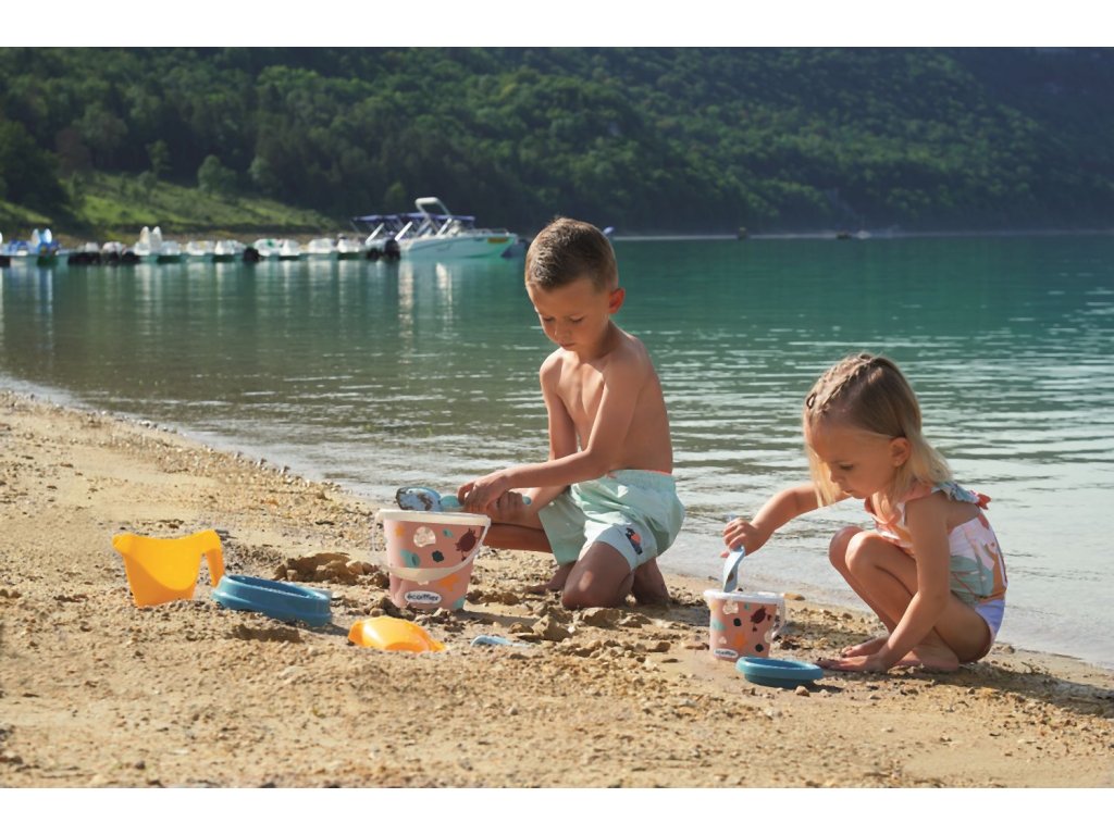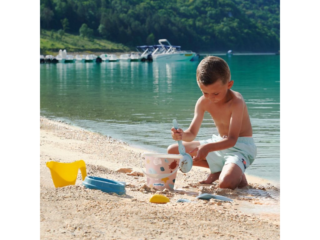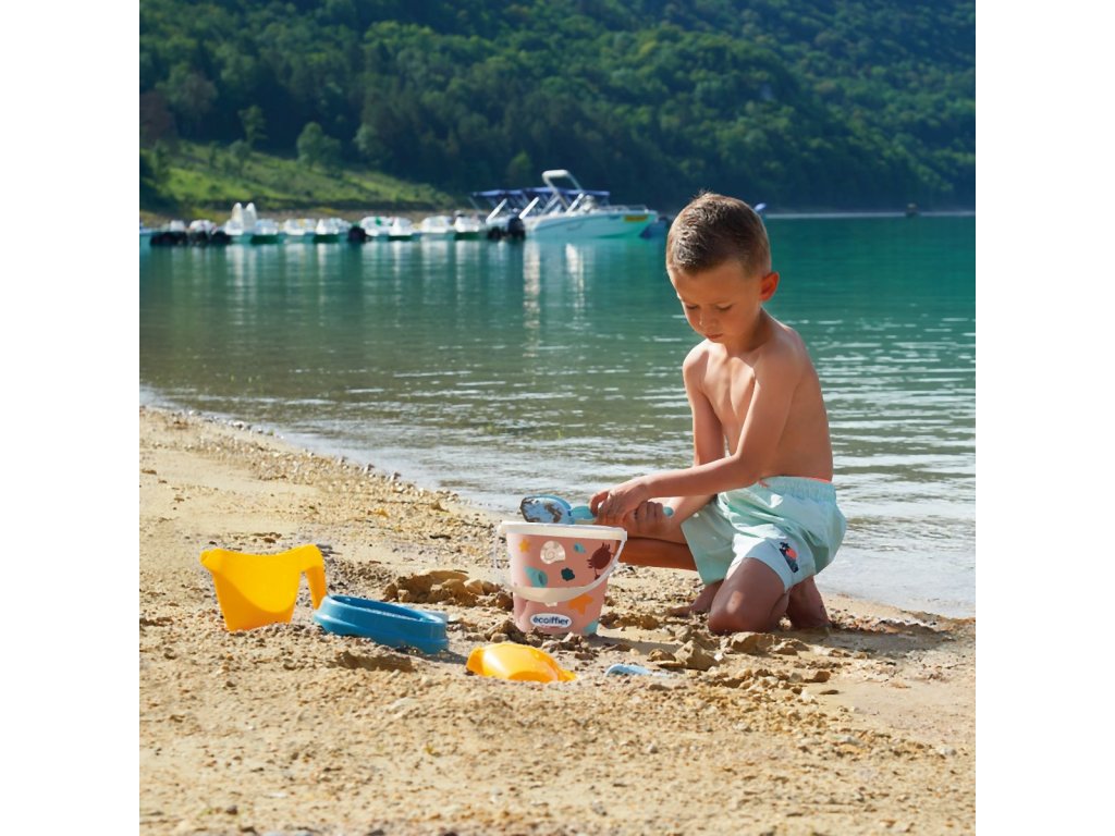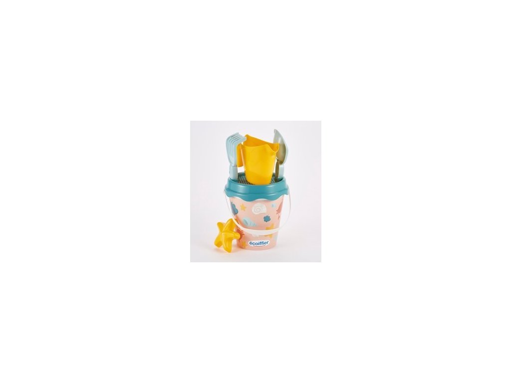 Kbelík s mořským dekorem 17 cm. Součástí balení je formička na písek, rýč, hrábě, konvička a sítko.