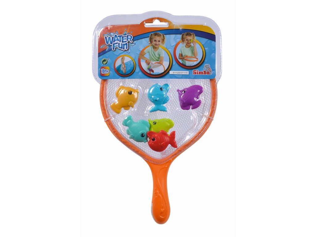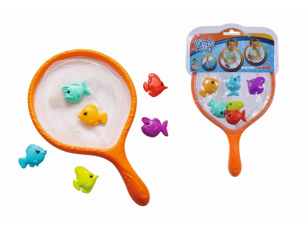 Rybářský podběrák se sítí o velikosti 31 cm a 6 různě barevných ryb o velikosti 5,5 cm.