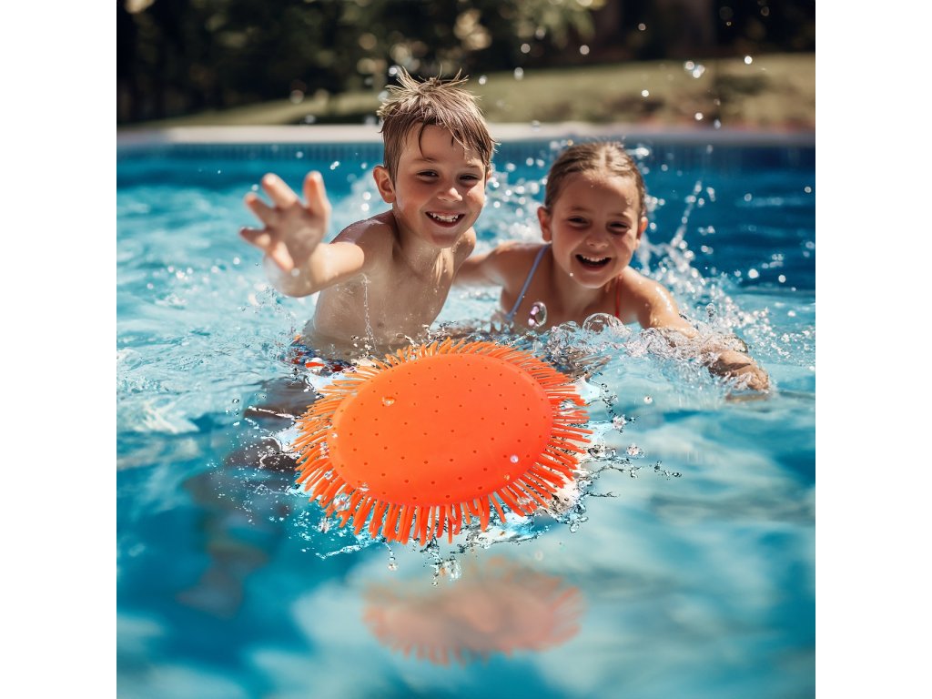 Léto, koupačka a nesmí chybět vodní frisbee. Namoč ho do vody a hoď. Krásně letí a při letu cáká vodu.