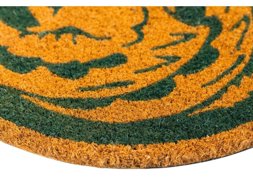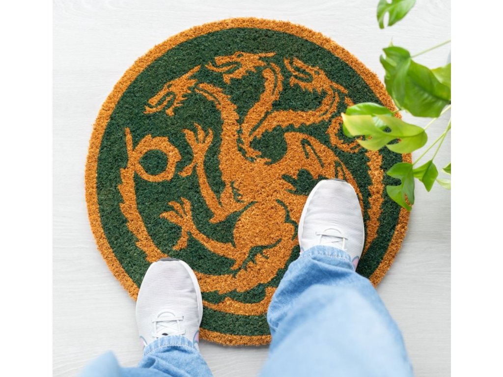 Zelená rohožka s grafikou zlatého znaku draka ze seriálu House of the Dragon (Rod draka). Rohožka je vhodným doplňkem vchodových dveří pro každého menšího i většího fanouška.