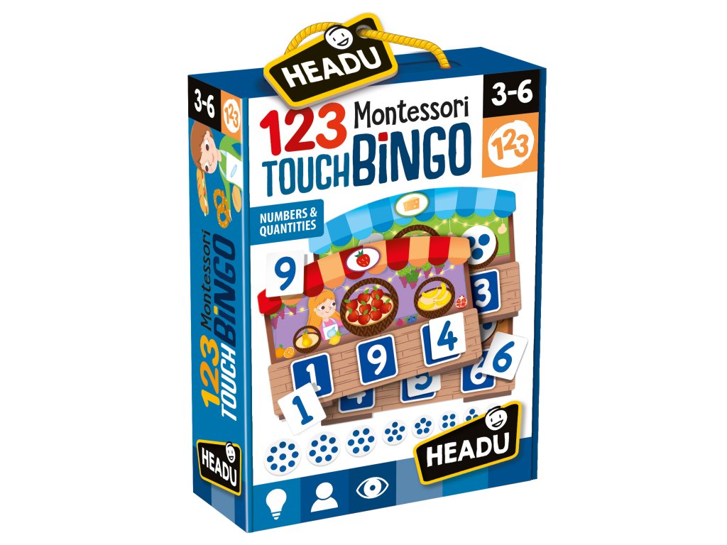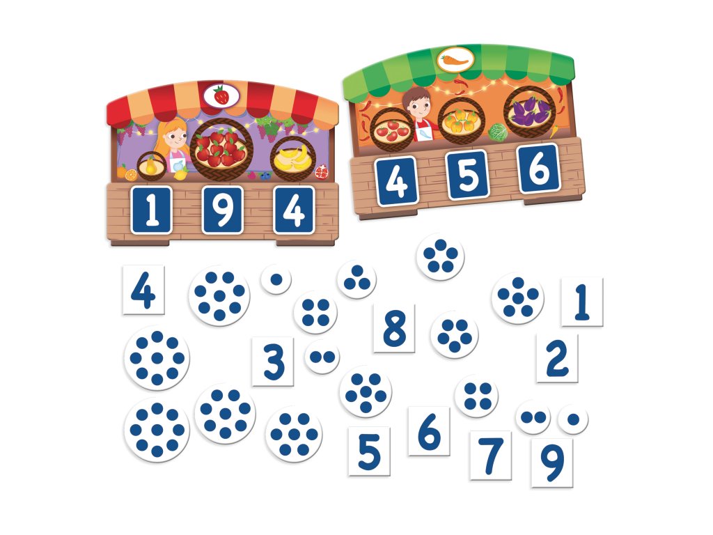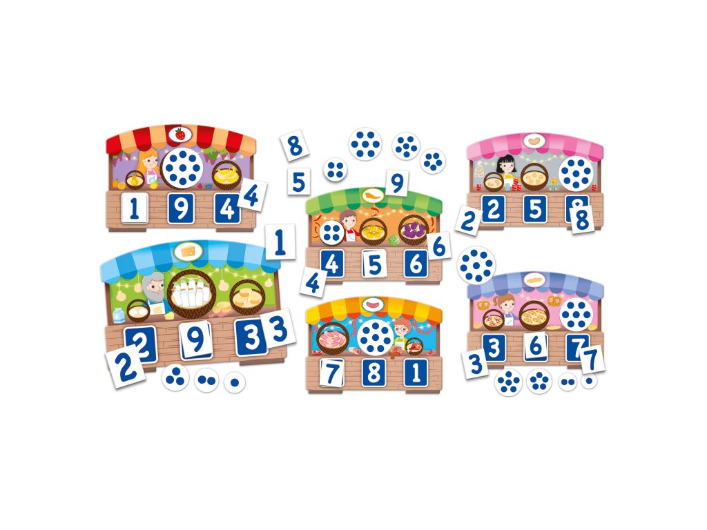 Obsah balení: 6 herních desek bingo s různými stánky a nabízenými druhy zboží, 18 obdélníkových dílků s čísly, 18 kulatých dílků se symboly množství, sáček z organické bavlny, průvodce výukou
