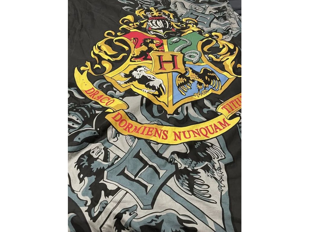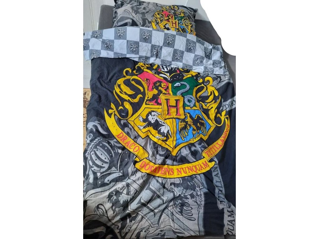 Černé ložní povlečení s grafikou barevného hlavního erbu školy čar a kouzel v Bradavicích. Oboustranné povlečení pro jedno lůžko ve stylu Harry Pottera - školy čar a kouzel v Bradavicích. Na každé straně naleznete jiný vzor, takže se vlastně jedná o dvě povlečení v jednom.