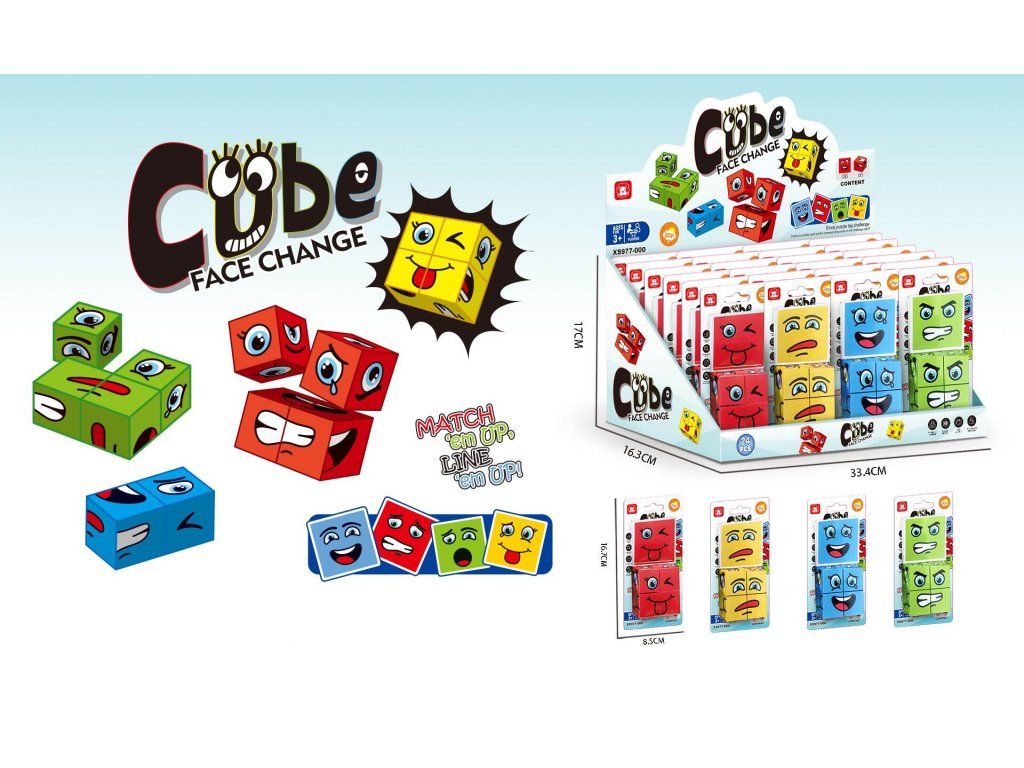 Magická kostka obličeje. Rozměry 5x5x2,5 cm. Skládej obličeje podle kartiček. Display box - 24 ks. 4 varianty - červená, žlutá, modrá, zelená.