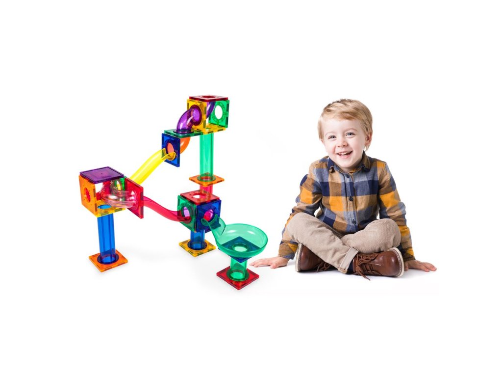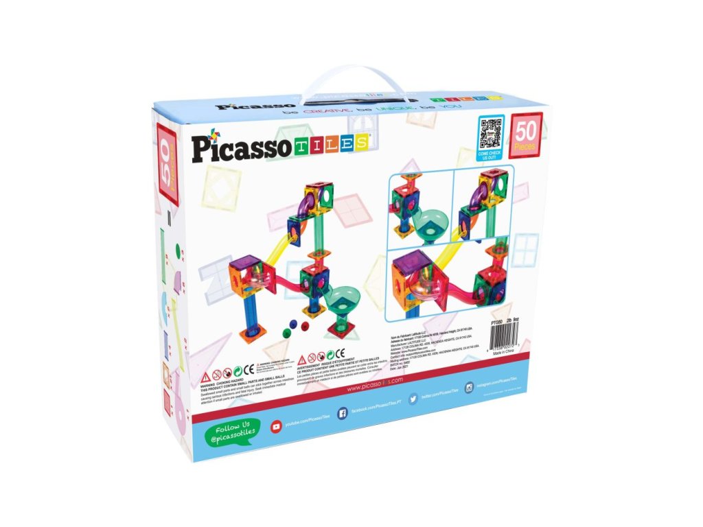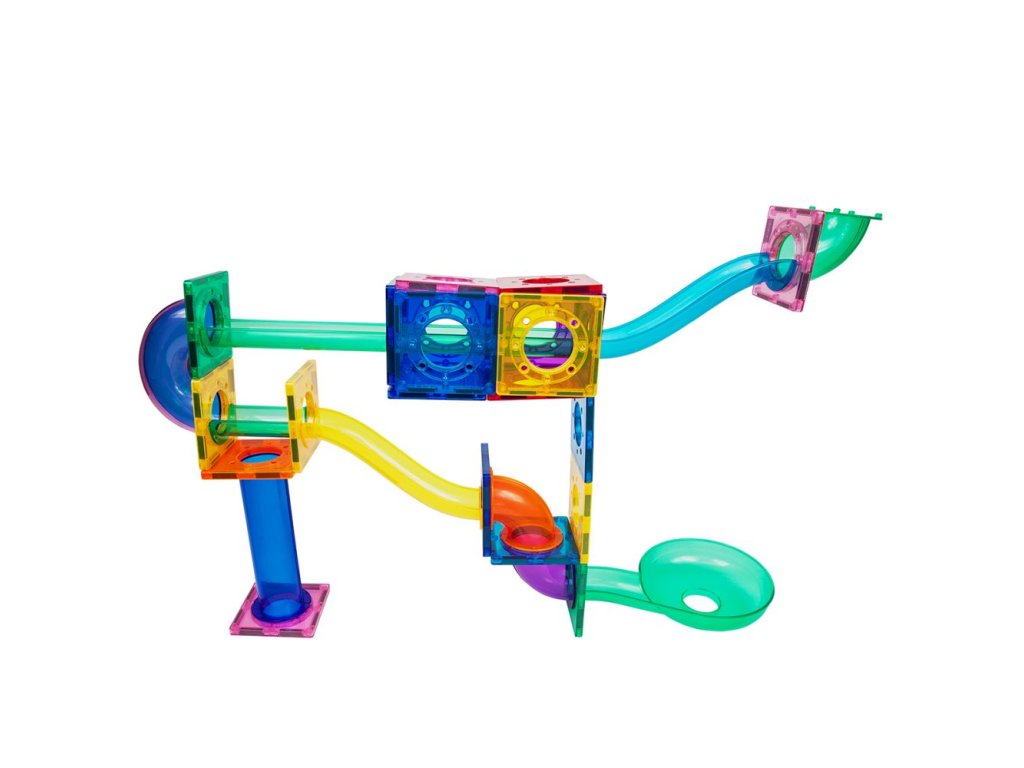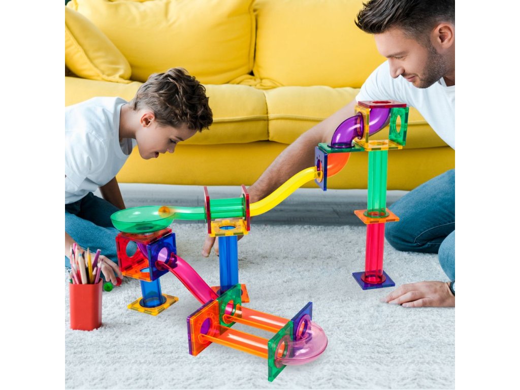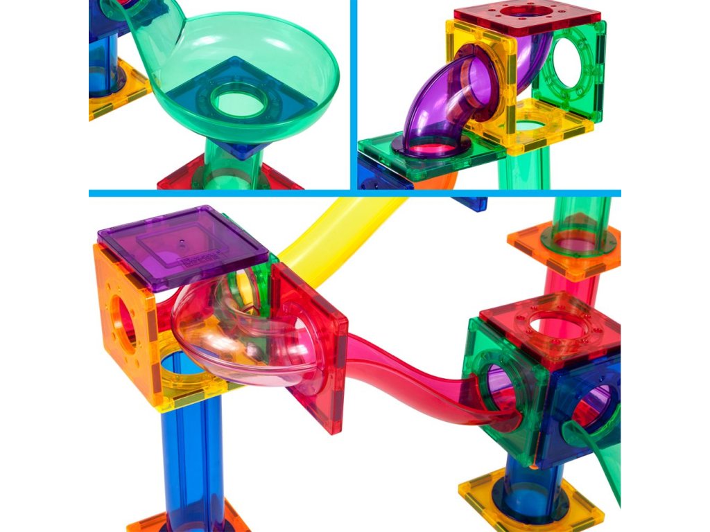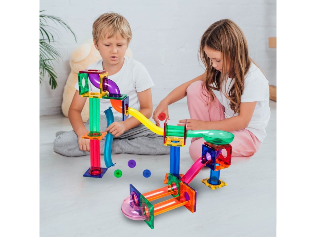 Obsahuje 50 magnetických stavebních dílků. Nabízí kuličkovou dráhu s klouby a trychtýři, kde kuličky projíždějí zatáčkami, překážkami a skluzavkami. Podporuje inženýrské dovednosti, objevování a kreativní experimentování. Poskytuje zábavu i vzdělávací STEM zkušenost.