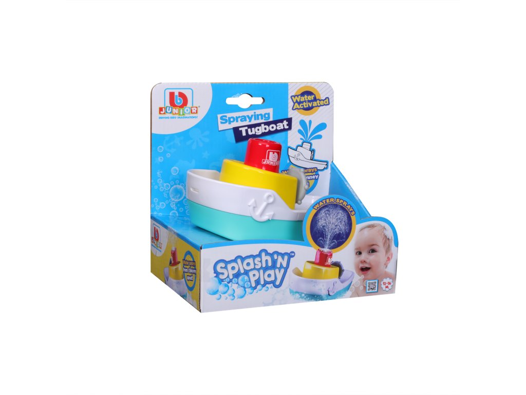 Člun s vodotryskem Splash'N Play od BB Junior zaručuje malým dětem spoustu zábavy při koupání. Loďku stačí umístit do vody ve vaně nebo v bazénu a sledovat, jak z jejího komínu automaticky stříká voda. Úžasný člun Splash'N Play učí děti principu příčiny a následku a zároveň zajišťuje hodiny zábavy. Člun je vhodný pro děti od 12 měsíců. Funguje na 2 baterie AAA, které nejsou součástí. Velikost člunu je 5,9” (15 cm). Rozměr balení: 16 x 16,55 x 12,1cm.