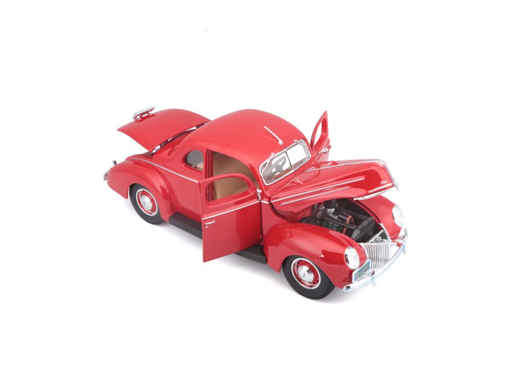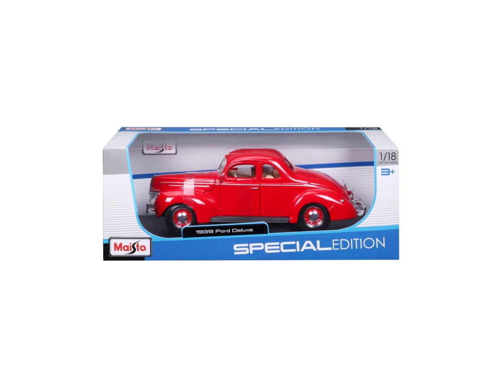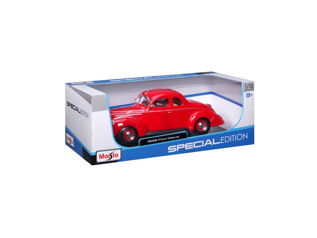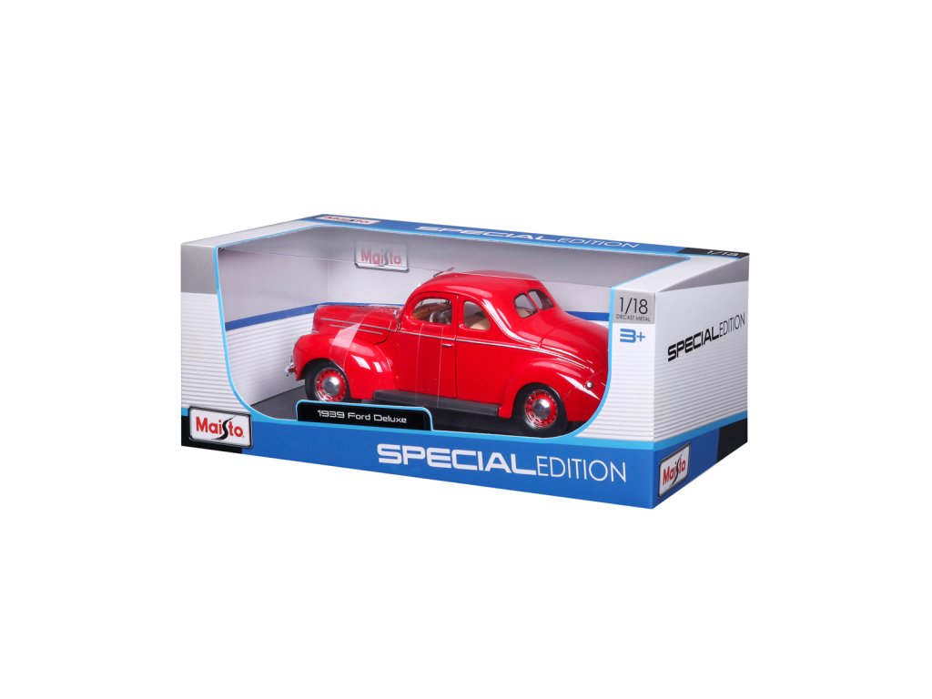 Model Maisto Special Edition 1939 Ford Deluxe Coupe Red 1:18 Diecast Vehicle je detailně zpracovaný odlitek. Replika s tlakově litou kovovou karoserií s plastovými díly. Otevírací dveře a motorový prostor. Plně funkční řízení s odpružením všech kol. Detailní podvozek se samostatným výfukovým systémem. Upevněno na plastovém stojanu. Kovový odlitek v měřítku 1:18. Rozměr výrobku: 33x12,4x16,4cm. Věk: 3+