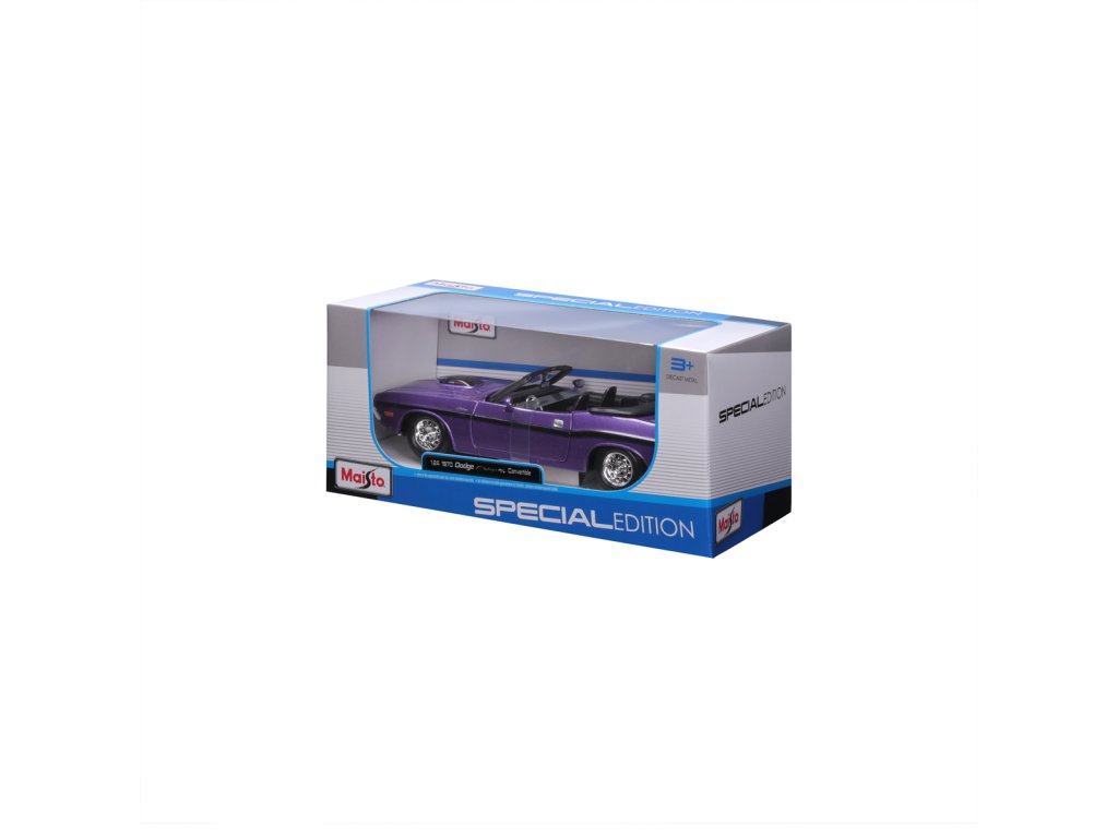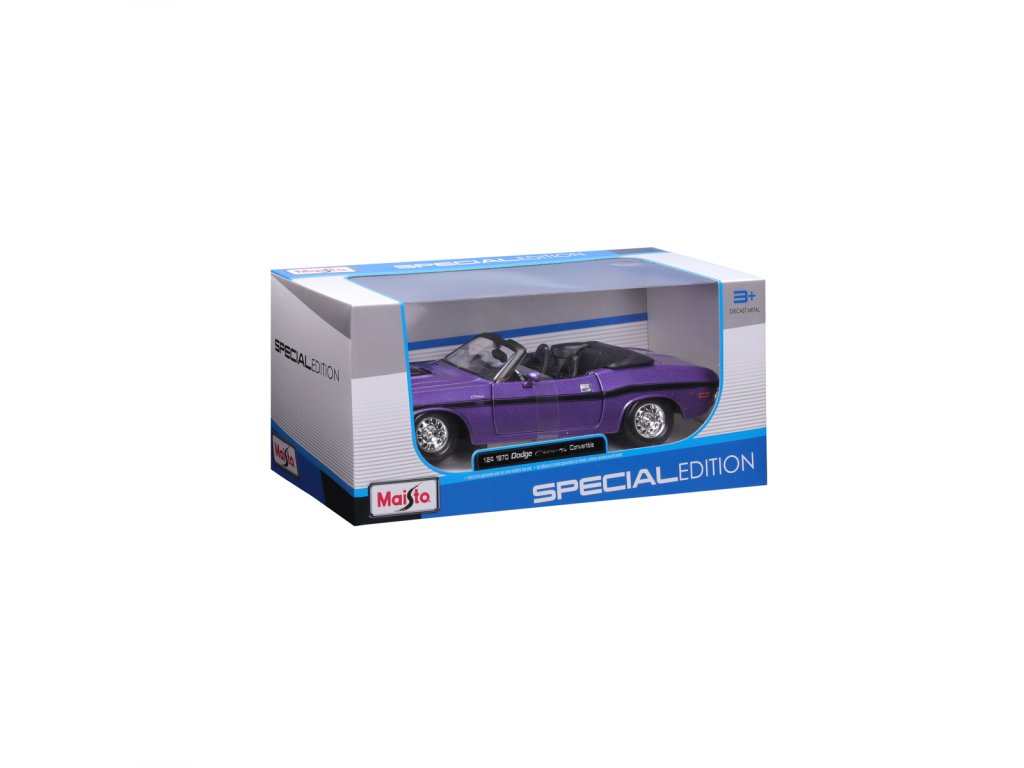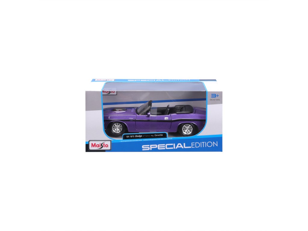 1970 Dodge Challenger R/T Convertible. Kovové modely Maisto v měřítku 1:24 patří mezi nejoblíbenější. Mají velmi dokonalé detailní provedení jednotlivých částí a kvalitní barevné provedení. Má otevíratelnou přední kapotu a přední dveře. Baleno v krabičce. Nevhodné pro děti do 3let. Rozměry balení: 22,8x10,5x11,4cm. Věk: 3+