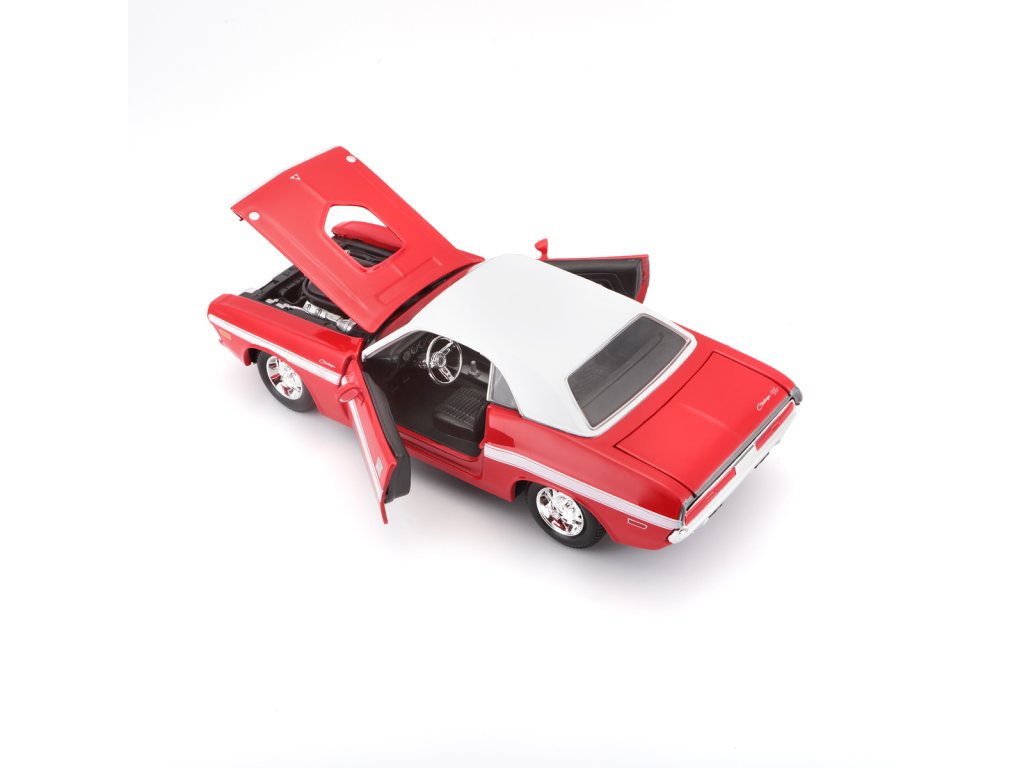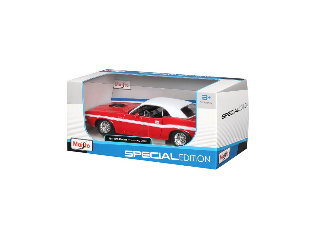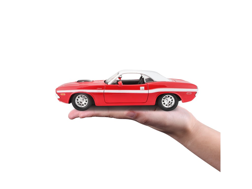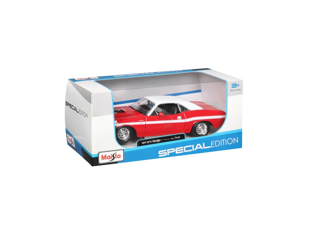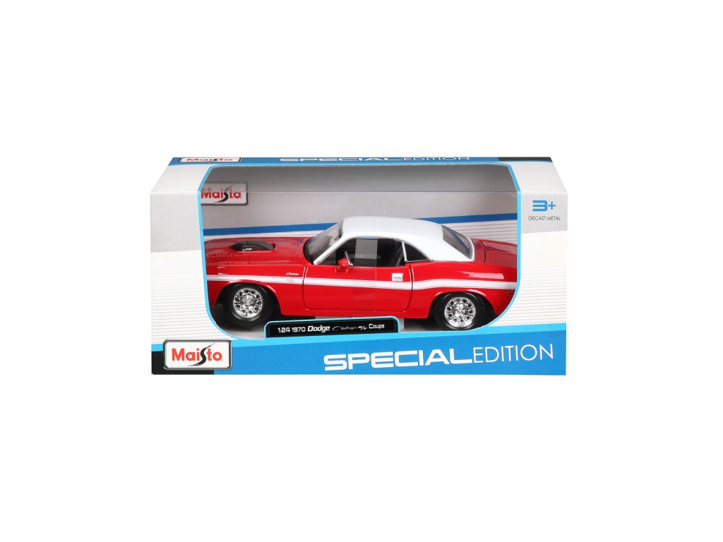 1970 Dodge Challenger R/T Coupe. Kovové modely Maisto v měřítku 1:24 patří mezi nejoblíbenější. Mají velmi dokonalé detailní provedení jednotlivých částí a kvalitní barevné provedení. Má otevíratelnou přední kapotu a přední dveře. Baleno v krabičce. Nevhodné pro děti do 3let. Rozměry balení: 22,8x10,5x11,4cm. Věk: 3+