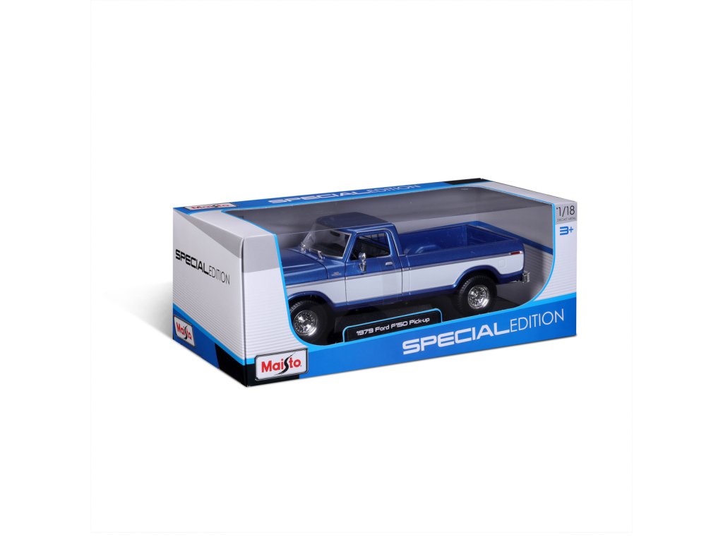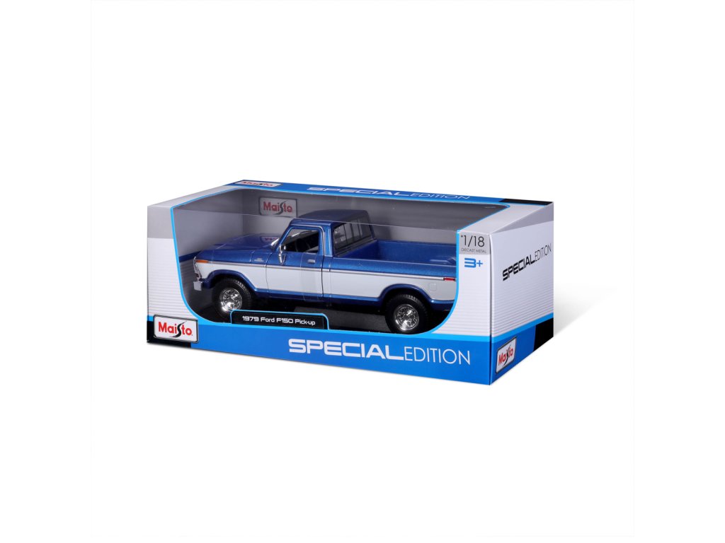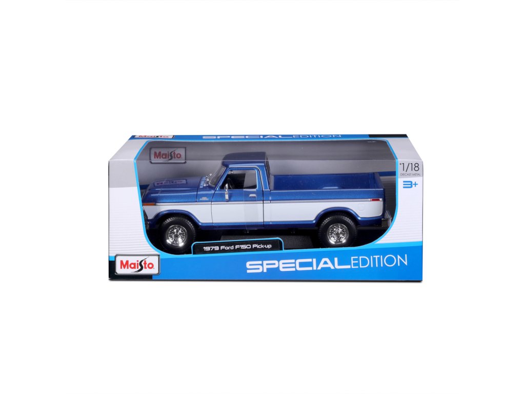 Maisto 1:18 Ford 1979 F150 Pick up Truck metal modro-bílý model auta. Modely autíček Maisto ze speciální edice jsou odolné pro hraní a zároveň si zachovávají maximální možnou míru detailů. Ideální jako dárek pro každého fanouška aut. Precizní sběratelský odlitek. Otevírací dveře. Detailní motor a interiér. Vlastní dvoubarevný lak. Chromovaná mřížka a ozdobné prvky. Gumové pneumatiky. Rozměry balení: 16,5x33x12,7cm. Věk: 3+