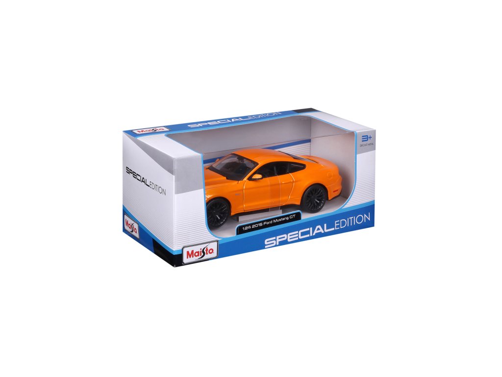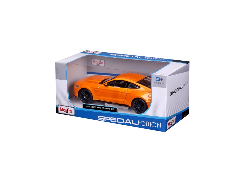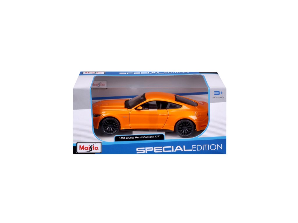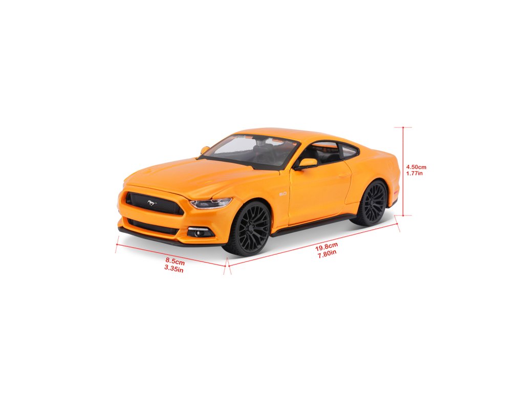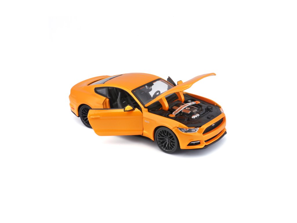 2015 Ford Mustang GT. Kovový model auta Ford Mustang Street Racer oranžové barvy v měřítku 1 : 24 značky Maisto. Auto otvírá dveře a kapotu motoru. Model má detailní zpracování karoserie včetně interiéru. Autíčko je vyrobené z kovu a plastu. Rozměry: 22,9 x 10,5 x 11,4 cm. Věk: 3+