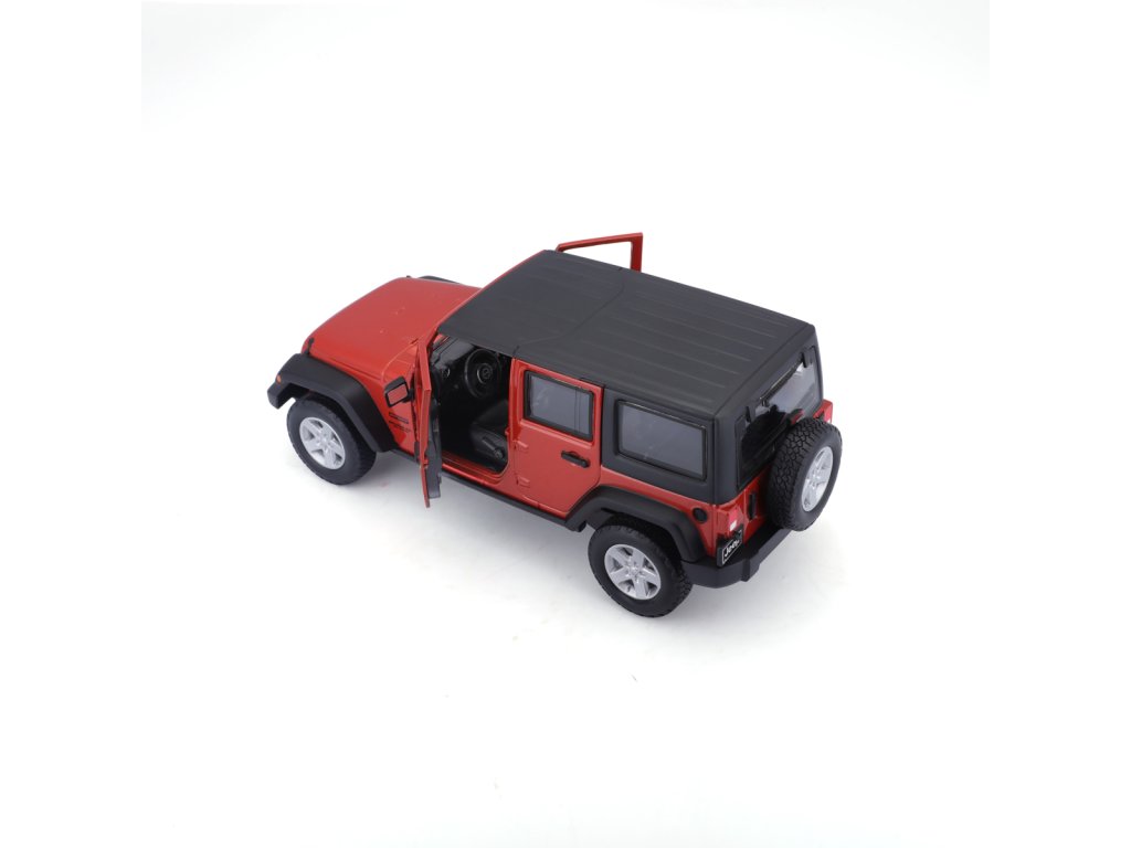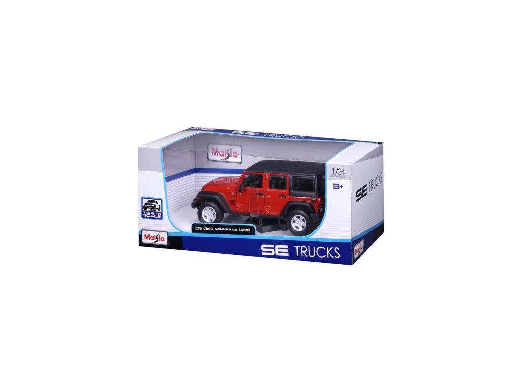 Jeep Wrangler Unlimited 2015 má řiditelná kola, gumové pneumatiky, otevírací dveře a kapotu. Vyrobeno z kovového odlitku s plastovými díly. Detailně zpracovaný interiér a exteriér. Rozměr balení: 30,5x15,8x14,5cm. Věk: 3+