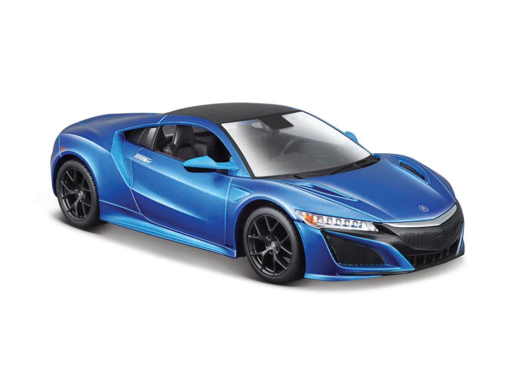 2017 Acura NSX. Model sportovního auta značky Acura v měřítku 1:24. Model má velmi dokonalé, detailní provedení jednotlivých částí a kvalitní barevné provedení. Auto má otevíratelné dveře. Kovový model s plastovými doplňky v atraktivní modré metalíze. Rozměry balení: 22,8x10,5x11,4cm. Věk: 3+