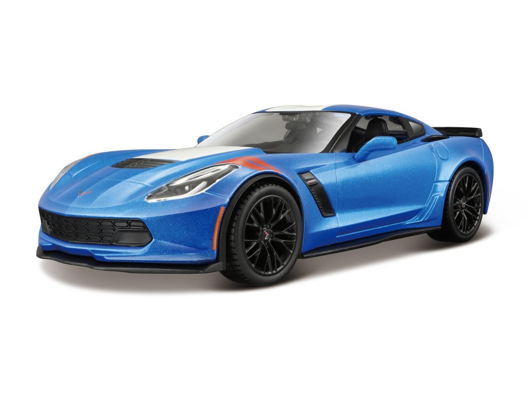 2017 Corvette Grand Sport. Model sportovního auta Corvette Grand Sport v modrém provedení a měřítku 1:24. Model má velmi dokonalé, detailní provedení jednotlivých částí a kvalitní barevné provedení. Auto má otevíratelné dveře. Rozměry: 22,9 x 10,5 x 11,4 cm. Věk: 3+