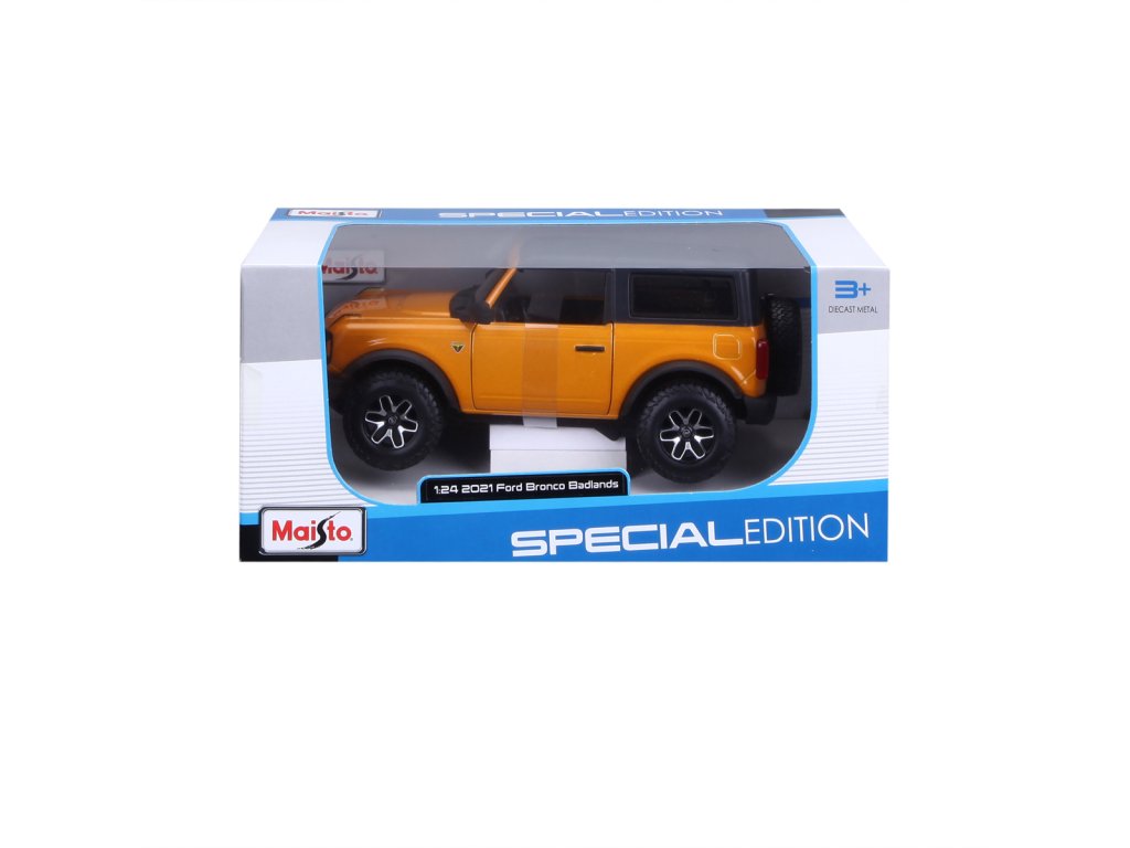 2021 Ford Bronco. Model terénního auta značky Ford Bronco v měřítku 1:24. Model má velmi dokonalé, detailní provedení jednotlivých částí a kvalitní barevné provedení. Auto má otevíratelné dveře. Kovový model s plastovými doplňky v atraktivní oranžové metalíze. Rozměry balení: 22,8x10,5x11,4cm. Věk: 3+