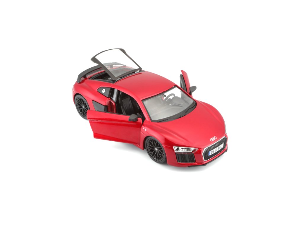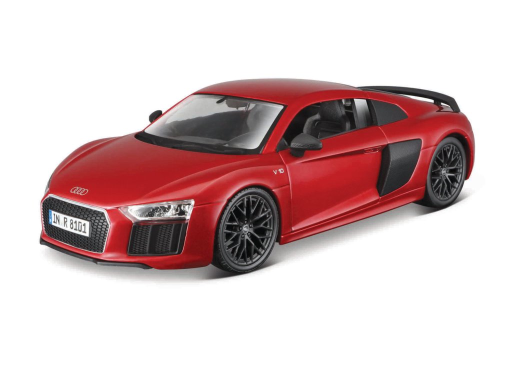 Audi R8 V10 Plus. Skládací model auta je v měřítku 1:24. Model auta se skládá podle obrázkového návodu, který je součástí stavebnice. Jednotlivé části se spojují tlakem bez pomoci lepidla. Součástí balení je šroubovák. Z kovového vstřikovacího odlitku s plastovými díly. Balení obsahuje 42 dílů. Rozměry: 22,9x16,8x 10,2 cm. Věk: 8+