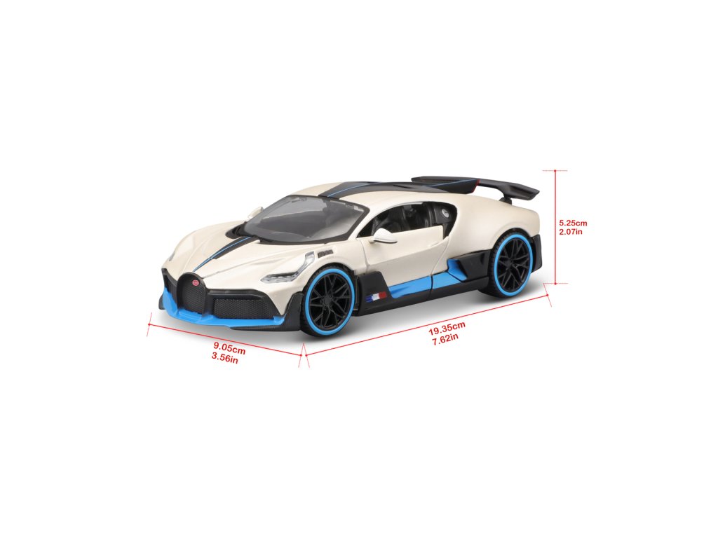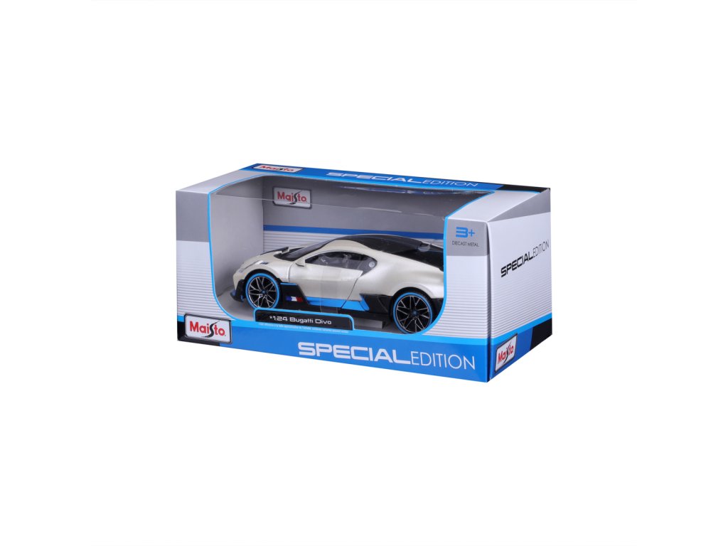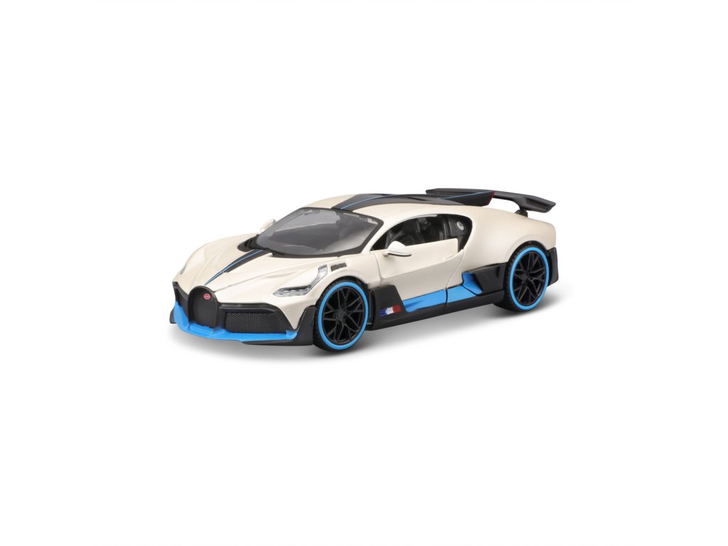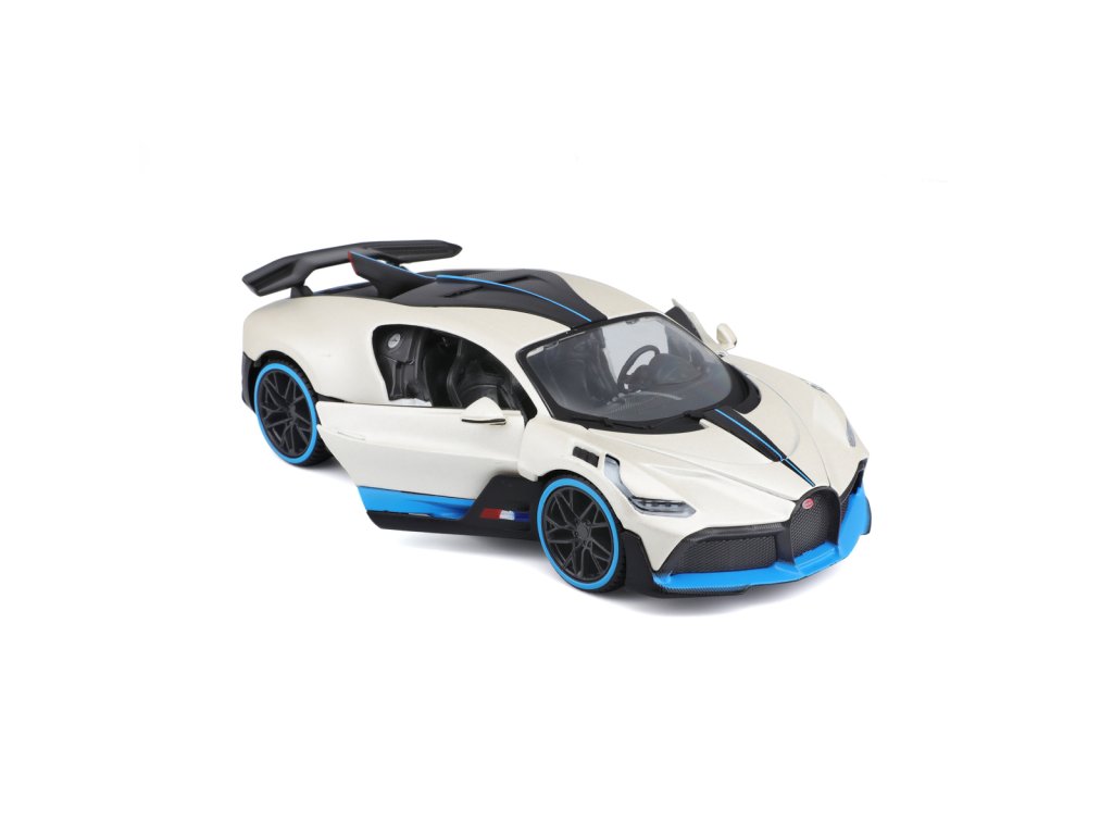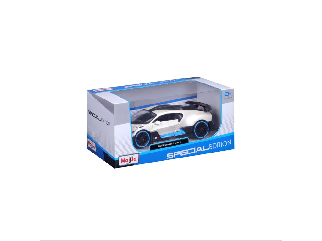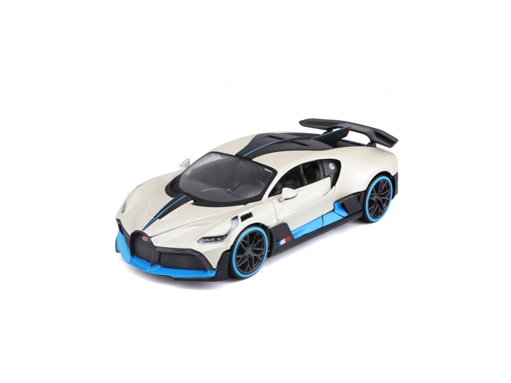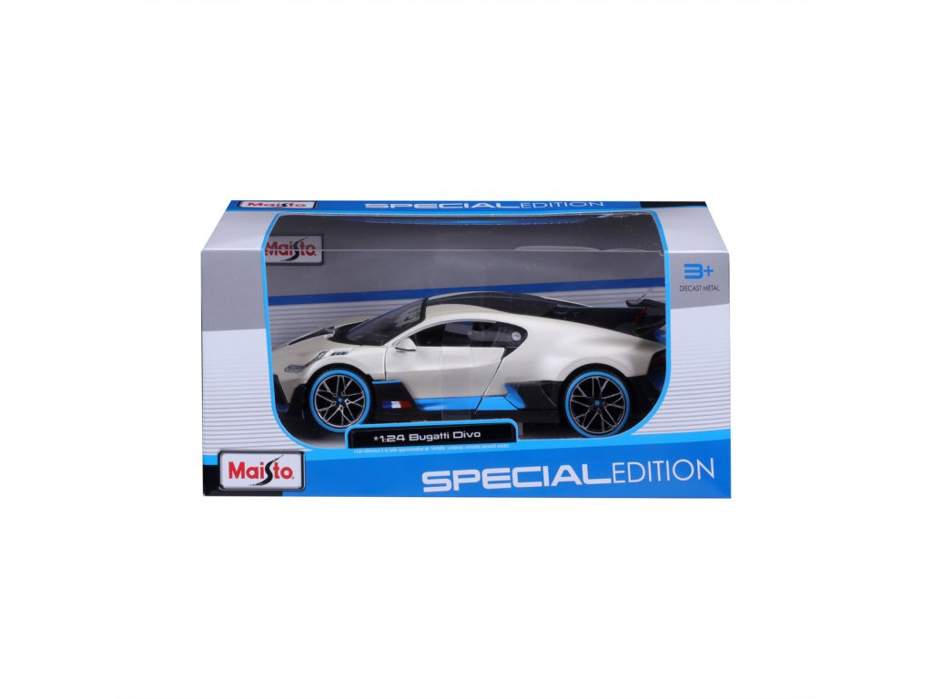 Bugatti Divo, metal bílá. Kovové modely Maisto v měřítku 1:24 patří mezi nejoblíbenější. Mají velmi dokonalé detailní provedení jednotlivých částí a kvalitní barevné provedení. Má otevíratelnou přední kapotu a přední dveře. Baleno v krabičce. Nevhodné pro děti do 3let. Rozměry balení: 22,8x10,5x11,4cm. Věk: 3+